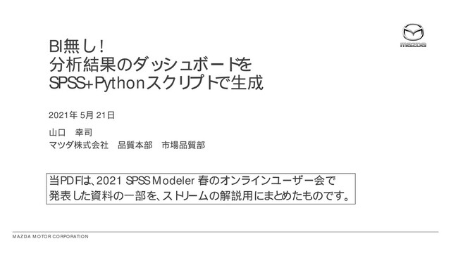 2021/05/21に開催されたSPSS オンラインユーザー会のご講演 マツダ株式会社 山口様 「BI無し! 分析結果のダッシュボードを SPSS+Pythonスクリプトで生成」 のサンプルストリーム解説資料です。