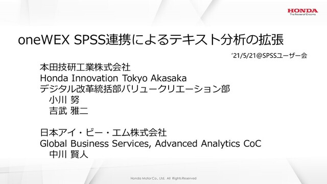 Tokyo Akasaka デジタル改革統括部バリュークリエーション部 小川 努 吉武 雅二 日本アイ・ビー・エム株式会社 Global Business Services, Advanced Analytics CoC 中川 賢人 oneWEX SPSS連携によるテキスト分析の拡張 ‘21/5/21@SPSSユーザー会