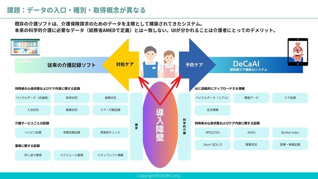 DeCaAI(Dementia Care Assist AI system)は、BPSDの発症を80%の確率で予測し適切な予防ケアを導出できるようになった。介護人材難・介護負担を緩和させるためにはAIによるBPSD予防、つまり本来の意味での科学的介護に軸足を移していく必要がある。現在、顕在化している課題をピックアップしてみた。