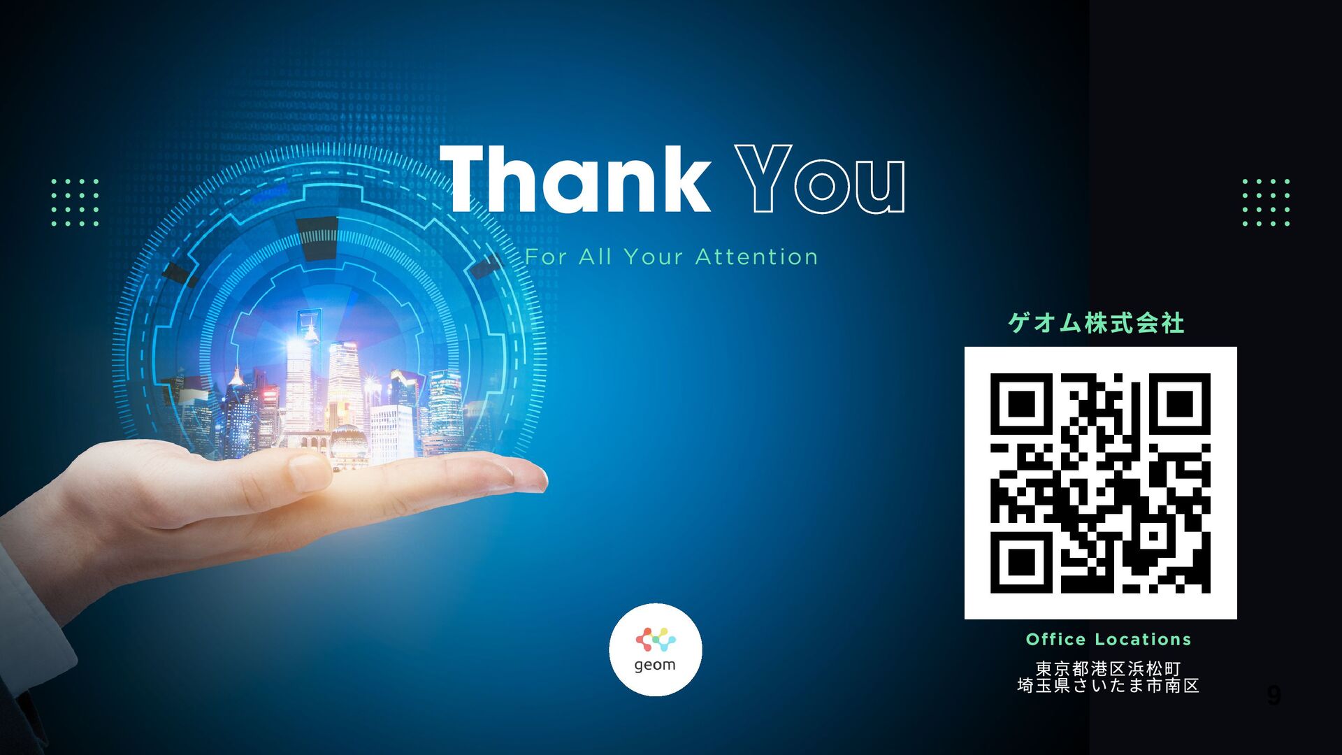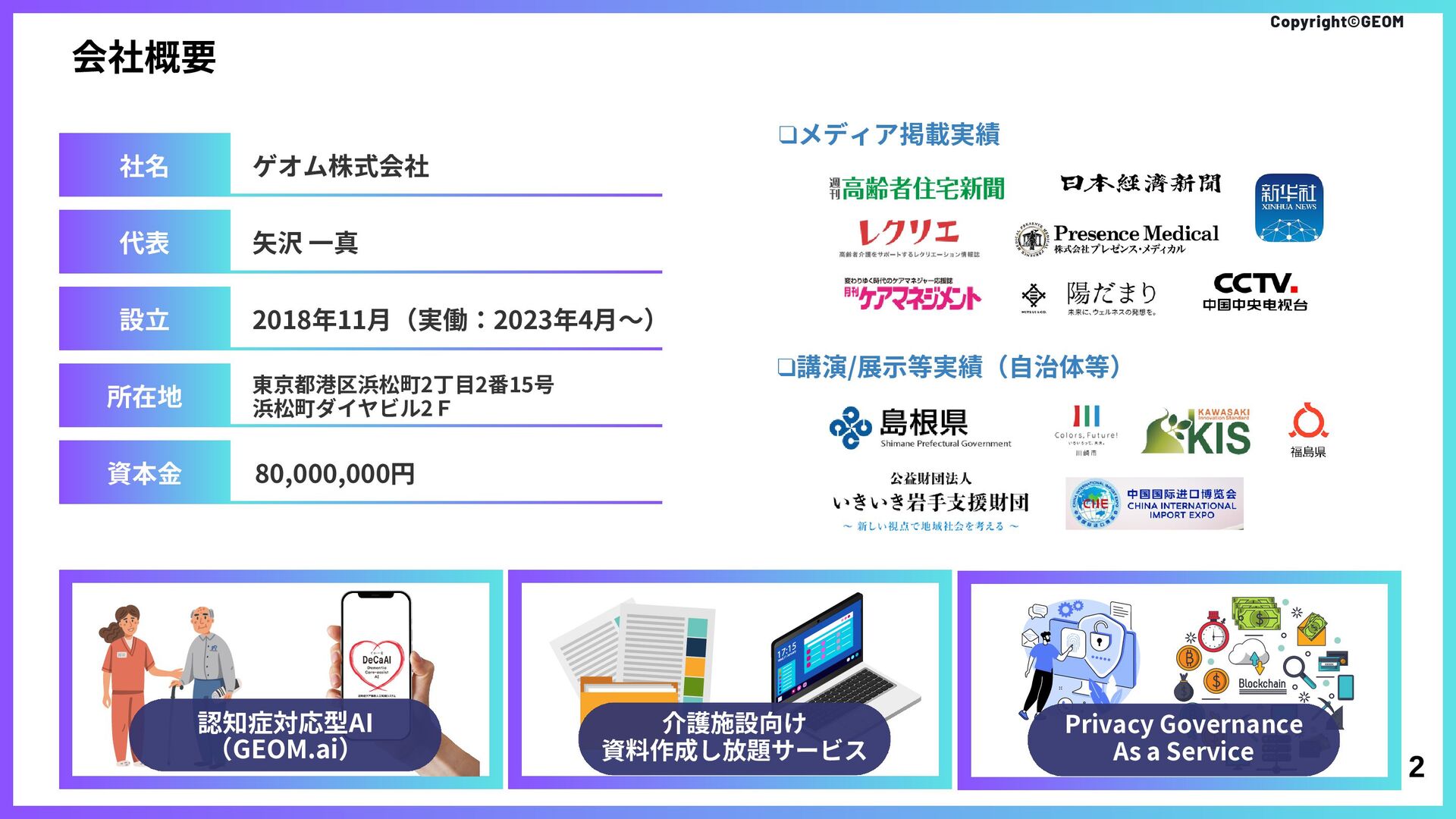 代表 矢沢 一真 設立 2018年11月(実働:2023年4月~) 所在地 東京都港区浜松町2丁目2番15号 浜松町ダイヤビル2F 資本金 80,000,000円 ❑メディア掲載実績 ❑講演/展示等実績(自治体等) 認知症対応型AI (GEOM.ai) Copyright©GEOM 2