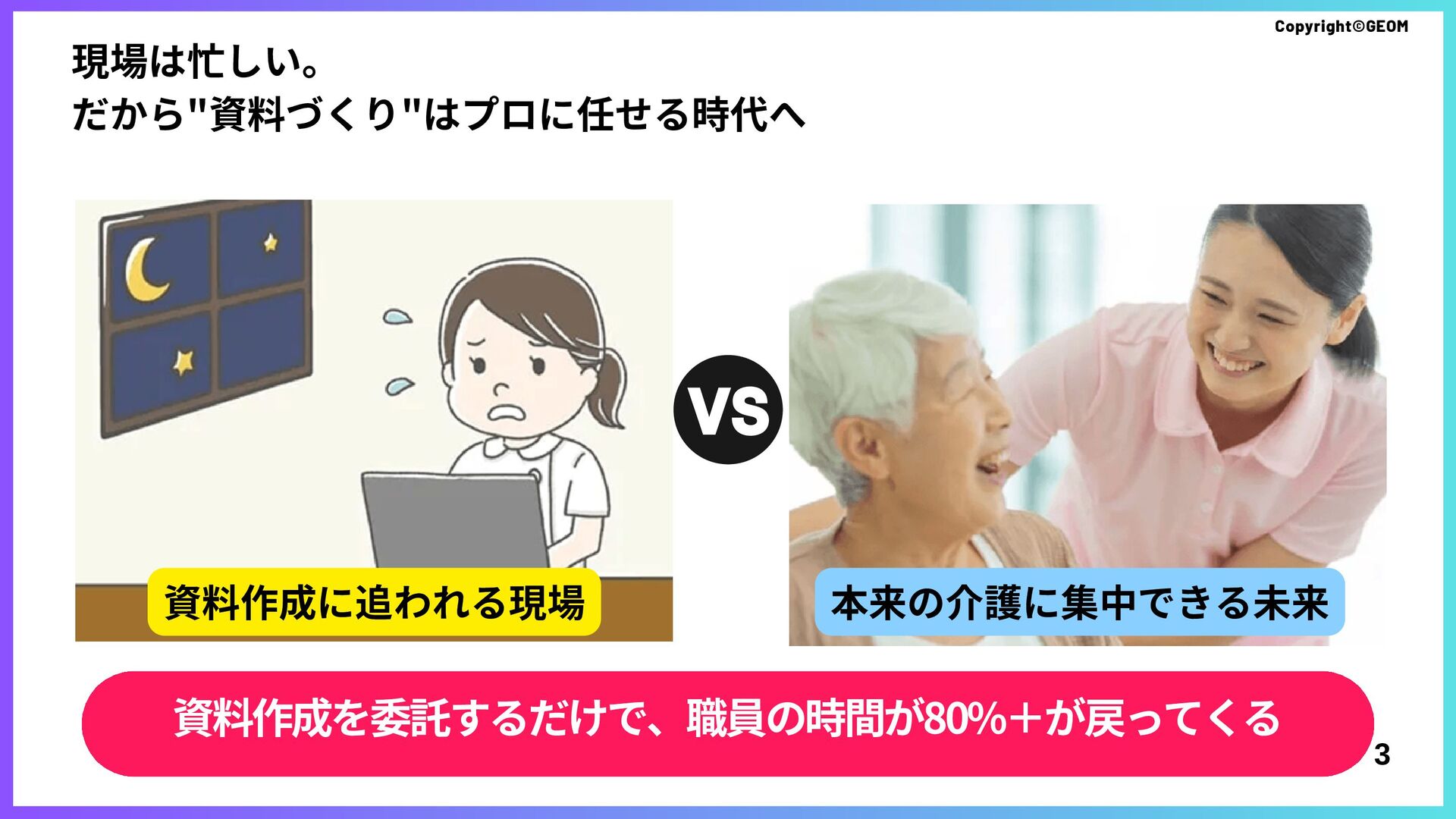 Copyright©GEOM 現場は忙しい。 だから"資料づくり"はプロに任せる時代へ 資料作成を委託するだけで、職員の時間が80%+が戻ってくる 資料作成に追われる現場 本来の介護に集中できる未来 3