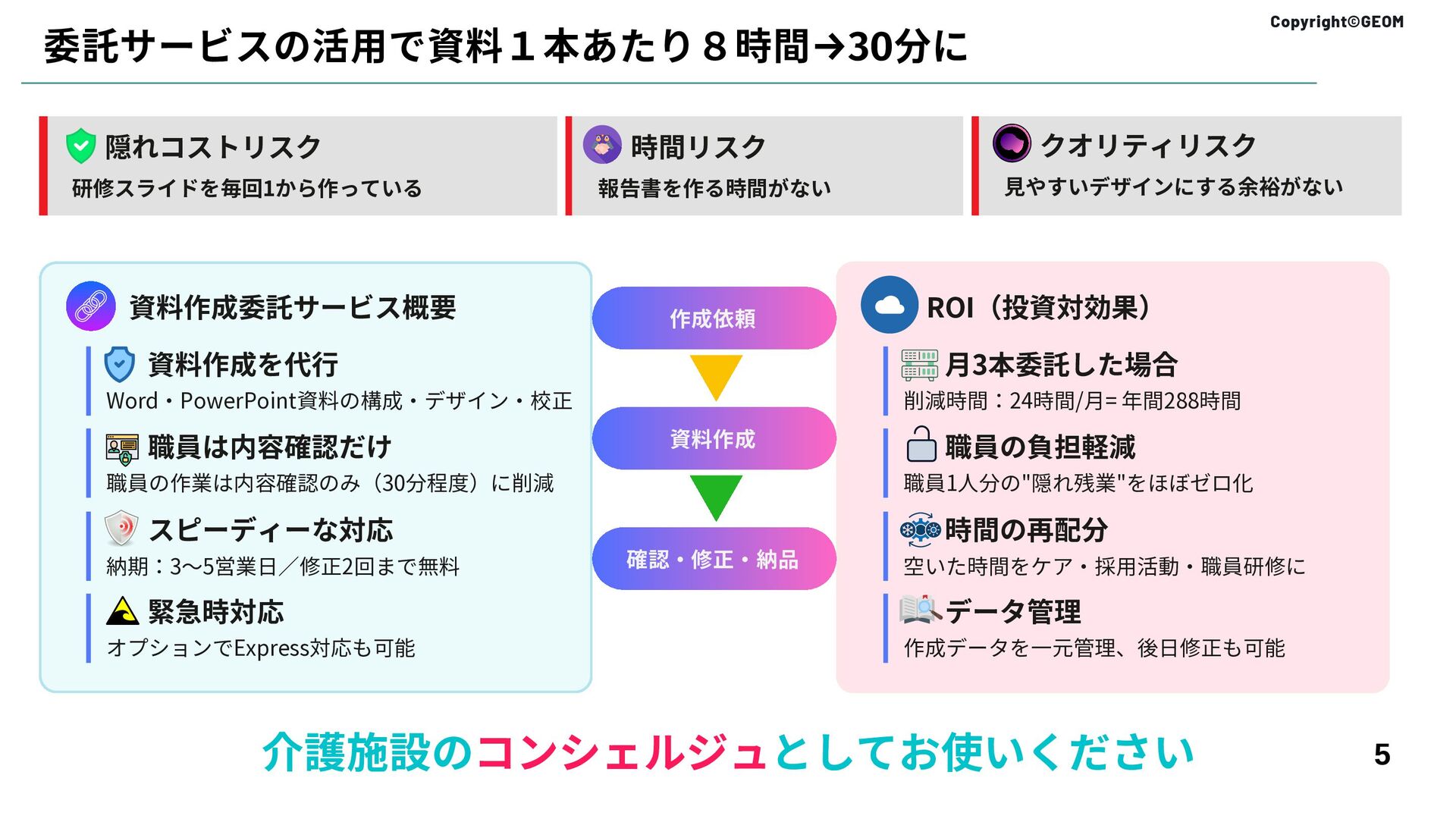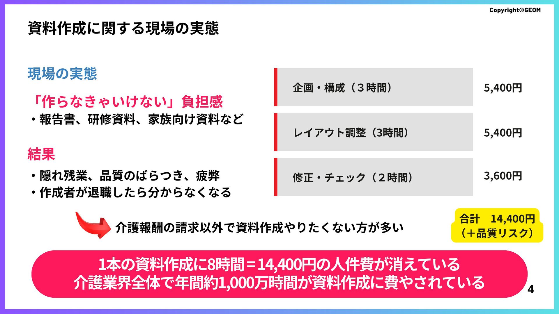 Copyright©GEOM 資料作成に関する現場の実態 1本の資料作成に8時間 = 14,400円の人件費が消えている 介護業界全体で年間約1,000万時間が資料作成に費やされている 企画・構成(3時間) レイアウト調整(3時間) 修正・チェック(2時間) 5,400円