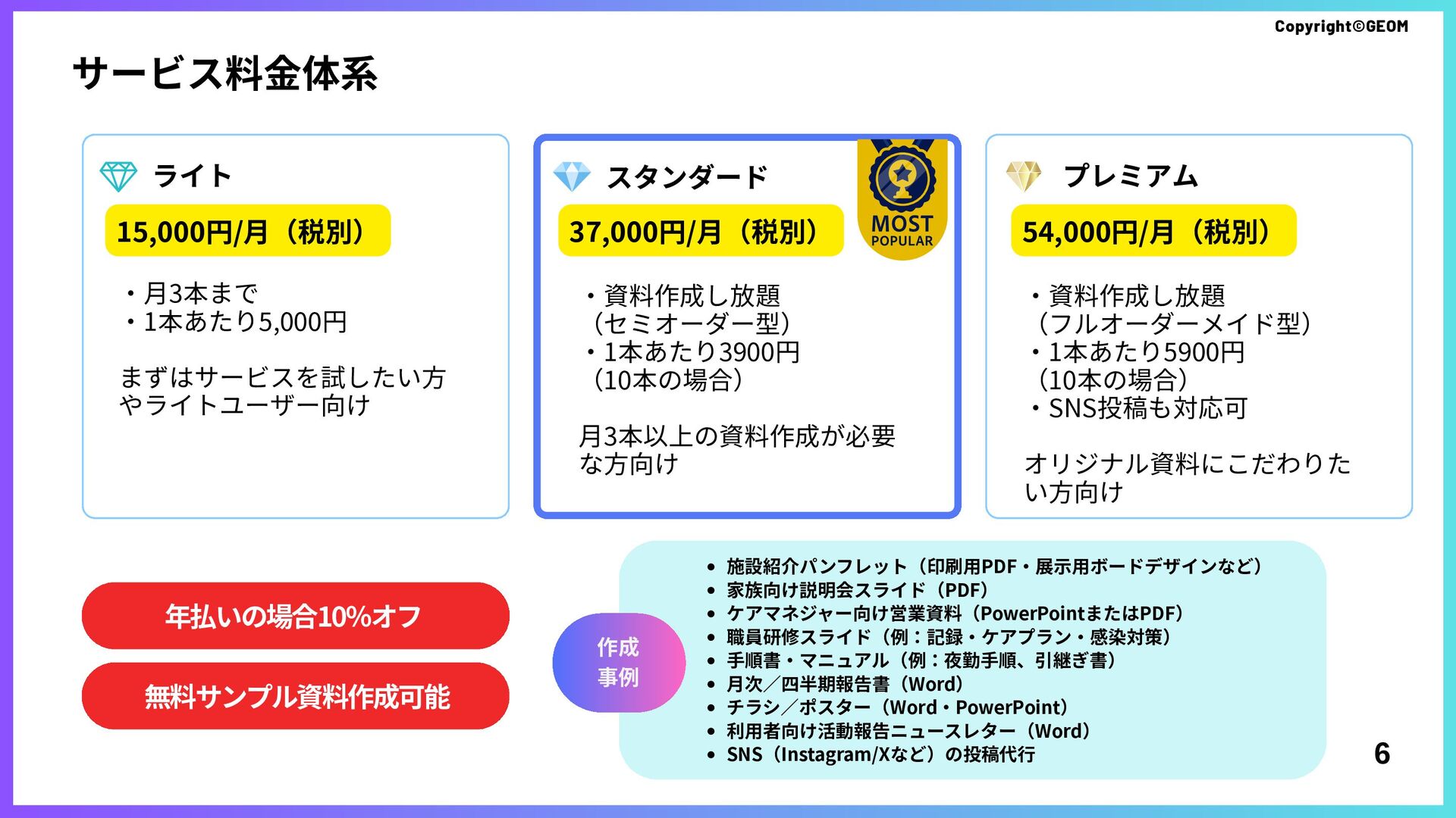 ・資料作成し放題 (セミオーダー型) ・1本あたり3900円 (10本の場合) 月3本以上の資料作成が必要 な方向け Copyright©GEOM サービス料金体系 年払いの場合10%オフ ライト