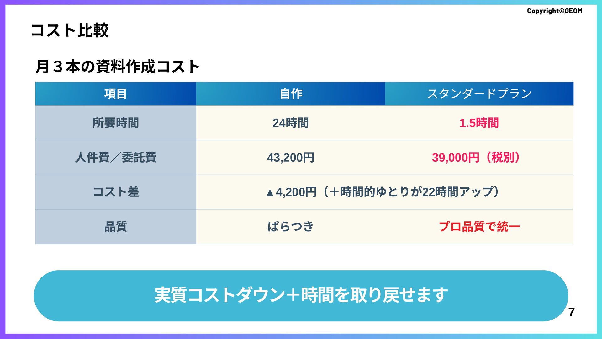 時間 人件費/委託費 43,200 円 39,000 円(税別) コスト差 ▲4,200 円(+時間的ゆとりが22 時間アップ) 品質 ばらつき プロ品質で統一 月3本の資料作成コスト 7