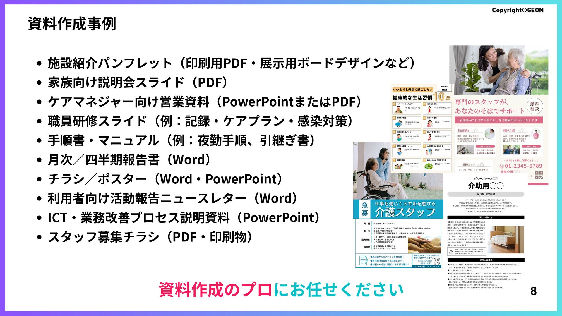 施設紹介パンフレット(印刷用PDF・展示用ボードデザインなど) 家族向け説明会スライド(PDF) ケアマネジャー向け営業資料(PowerPointまたはPDF) 職員研修スライド(例:記録・ケアプラン・感染対策) 手順書・マニュアル(例:夜勤手順、引継ぎ書) 月次/四半期報告書(Word) チラシ/ポスター(Word・PowerPoint) 利用者向け活動報告ニュースレター(Word) ICT・業務改善プロセス説明資料(PowerPoint) スタッフ募集チラシ(PDF・印刷物)