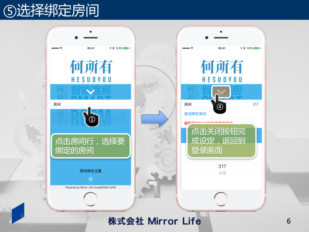 ⑤选择绑定房间 6 6 ① 点击房间行,选择要 绑定的房间 ④ 点击关闭按钮完 成设定,返回到 登录画面