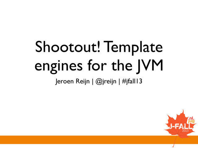 These slides were from my JFall 2013 presentation about new template engines for the JVM. During this presentation I gave a short introduction to new and interesting template engines and show how they compare to the most well known: JSP, Velocity and Freemarker.