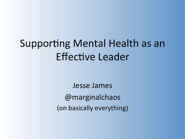 Survey: • 61% of employees didn’t know what MH benefits were available • 71% of current employers never formally discussed MH • 74% of employees either didn’t know about MH assistance available or weren’t provided resources • Over 50% either weren’t sure or wouldn’t discuss MH with coworkers • Over 70% of previous employers never formally discussed MH • 31% wouldn’t bring up a physical health issue with a poten&al employer • 62% wouldn’t bring up a mental health issue with a poten&al employer.