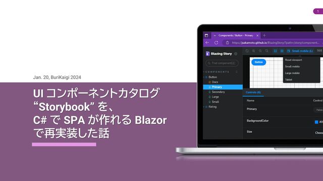で書けます ▪ ストーリー内では、同居してる Web アプリ本体で実装さ れている UI コンポーネントをインポートして参照 ▪ そのコンポーネントに備わっているパラメータなどのメタ 情報を付加 ▪ それらストーリーが Storybook の画面上に表示される 構造 Storybook とは UI コンポーネントカタログ // Button.stories.ts|tsx import type { Meta, StoryObj } from '@storybook/react'; import { Button } from './Button'; const meta: Meta<typeof Button> = { /* The title prop is optional. * See https://storybook.js.org/docs/react/configure * /overview#configure-story-loading * to learn how to generate automatic titles */ title: 'Button', component: Button, }; export default meta; type Story = StoryObj<typeof Button>; /* * Render functions are a framework specific feature * to allow you control on how the component renders. * See https://storybook.js.org/docs/react/api/csf * to learn how to use render functions. */ export const Primary: Story = { render: () => <Button primary label="Button" />, };