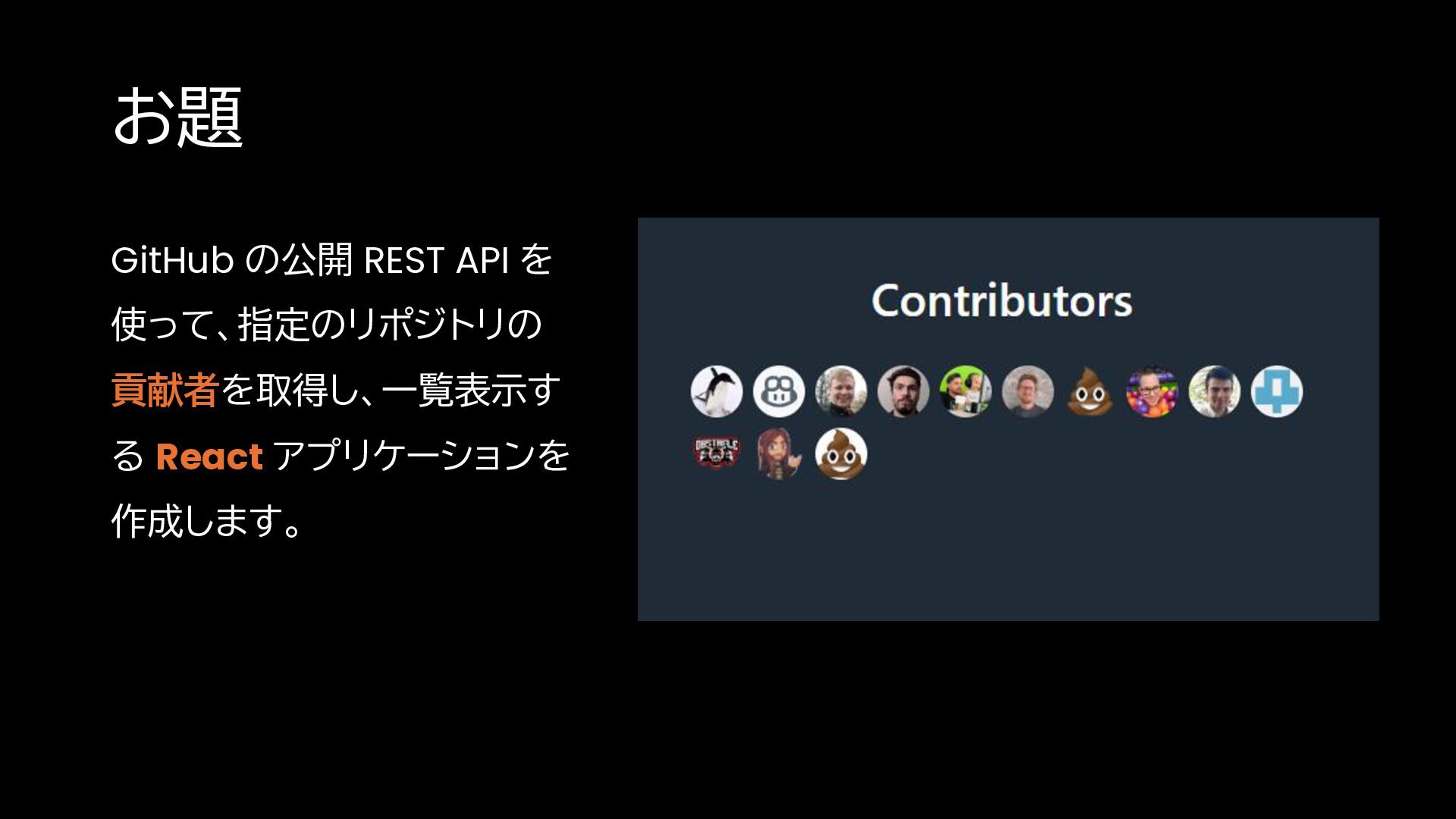 お題 GitHub の公開 REST API を 使って、指定のリポジトリの 貢献者を取得し、一覧表示す る React