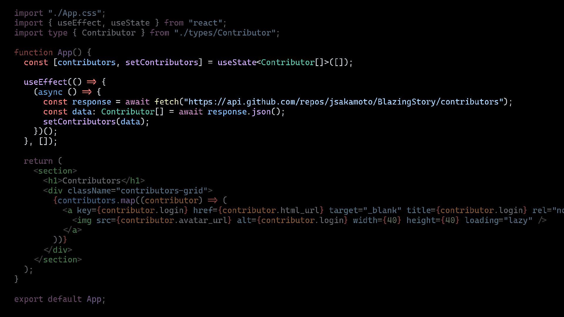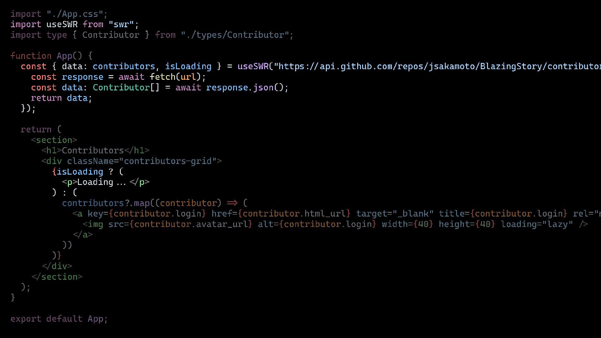 import type { Contributor } from "./types/Contributor" ; function App() { const { data: contributors , isLoading } = useSWR ( " http s :// api.github. com/ repos/jsakamoto/BlazingStory/contributors" const response = await fetch ( url ); const data : Contributor [] = await response . json (); return data ; }); return ( <section > <h1>Contributors </ h1> <div className ="contributors - grid" > { isLoading ? ( <p>Loading... </ p> ) : ( contributors ?. map(( contributor ) => ( <a key ={ contributor .login } href ={ contributor .html_url } target ="_blank" title ={ contributor .login } rel =" n <img src ={ contributor .avatar_url } alt ={ contributor .login } width ={ 40 } height ={ 40 } loading ="lazy" /> </ a> )) ) } </ div > </ section > ); } export default App;