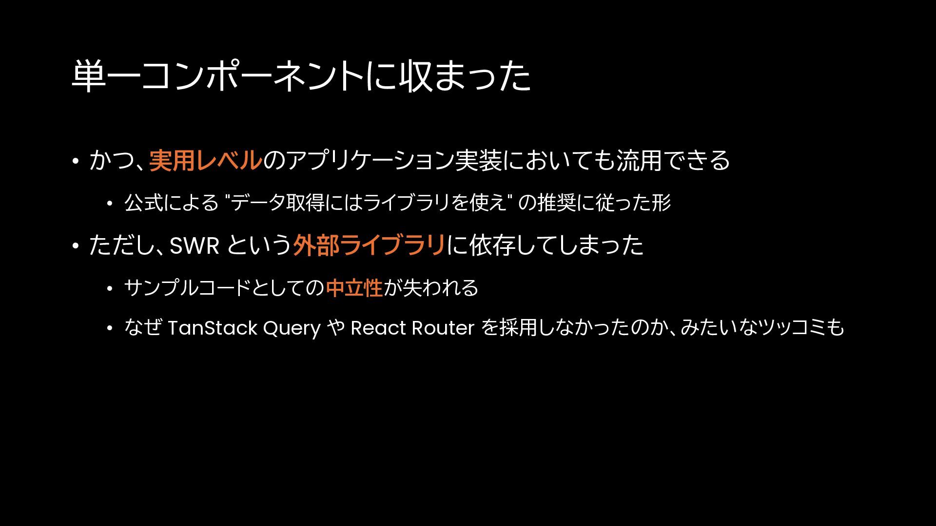 単一コンポーネントに収まった • かつ、実用レベルのアプリケーション実装においても流用できる • 公式による "データ取得にはライブラリを使え" の推奨に従った形 • ただし、SWR という外部ライブラリに依存してしまった