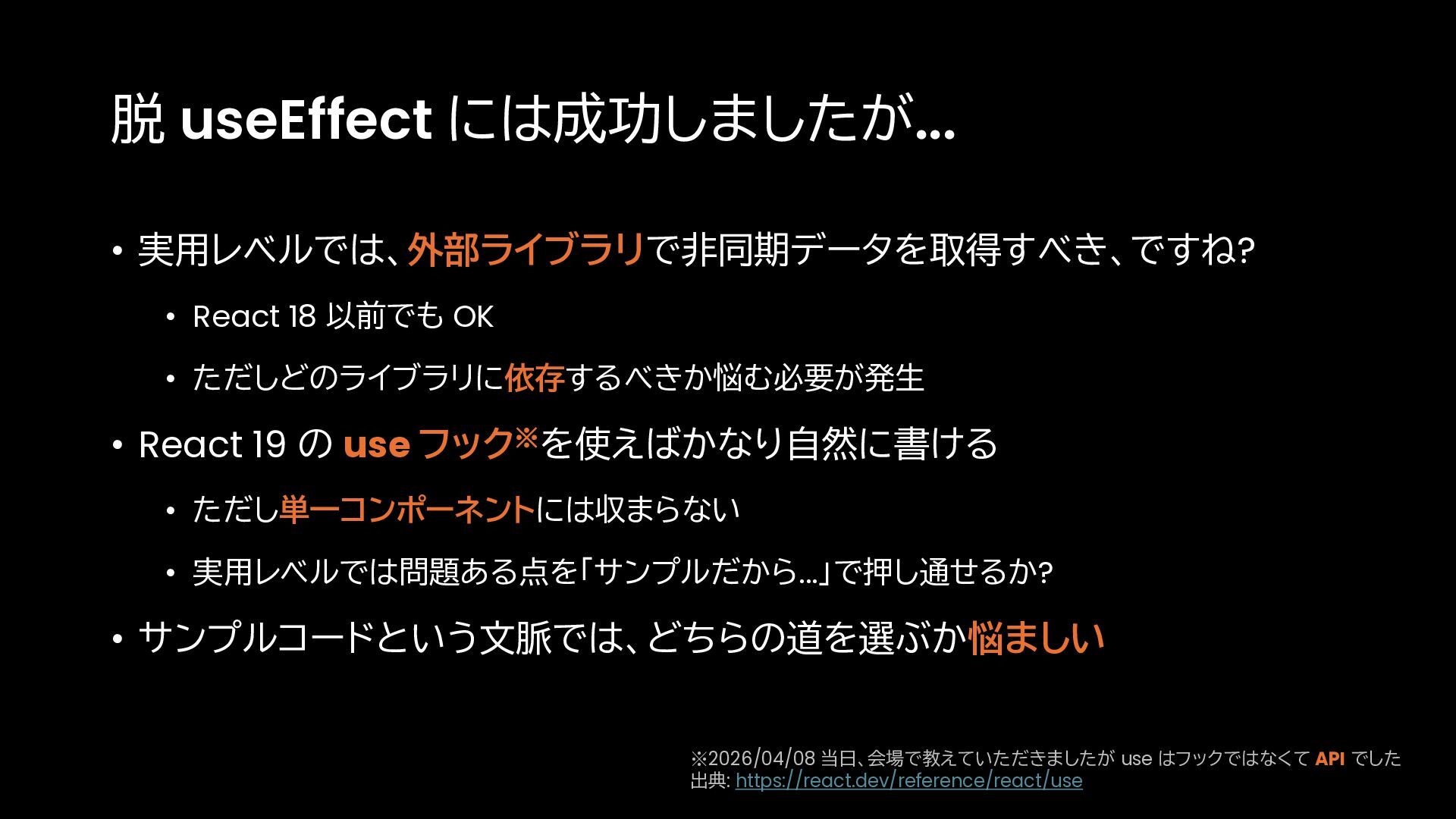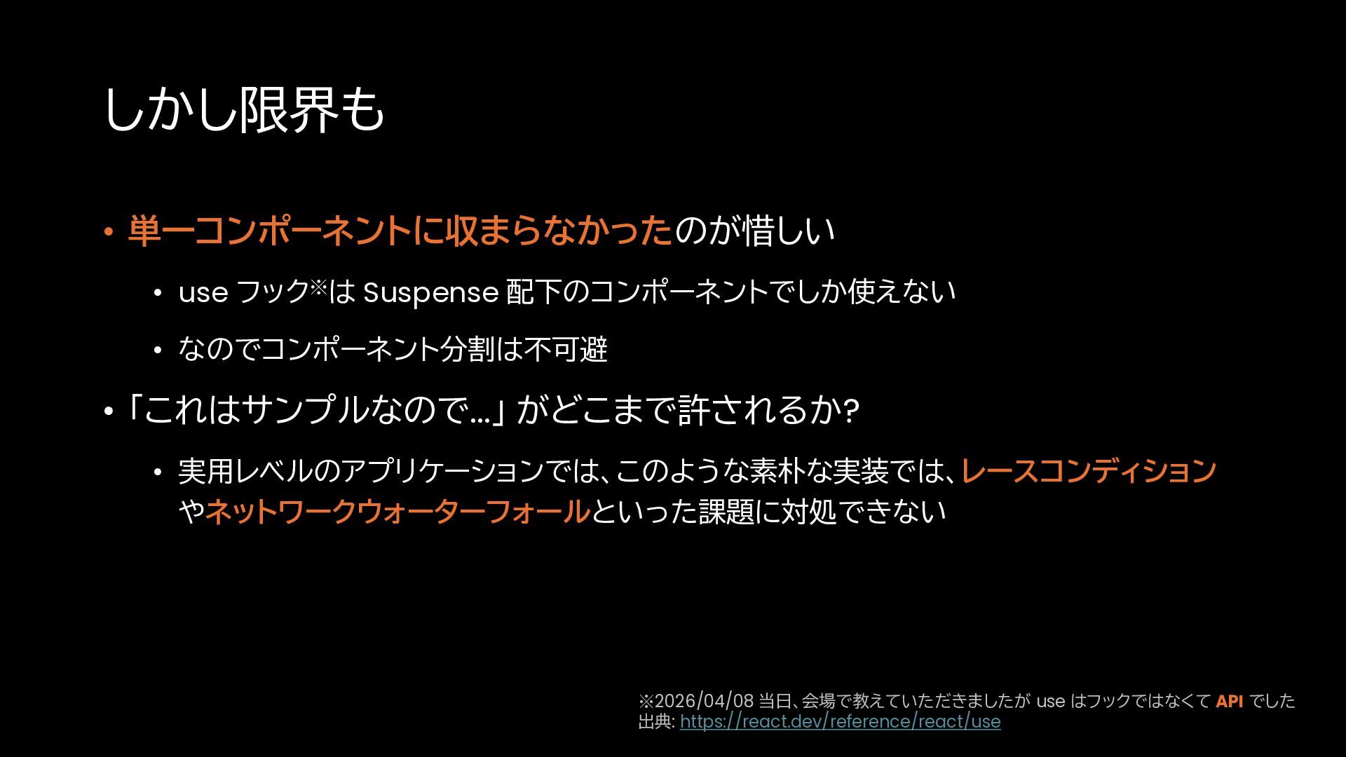 • 「これはサンプルなので...」 がどこまで許されるか? • 実用レベルのアプリケーションでは、このような素朴な実装では、レースコンディション やネットワークウォーターフォールといった課題に対処できない ※2026/04/08 当日、会場で教えていただきましたが use はフックではなくて API でした 出典: https://react.dev/reference/react/use