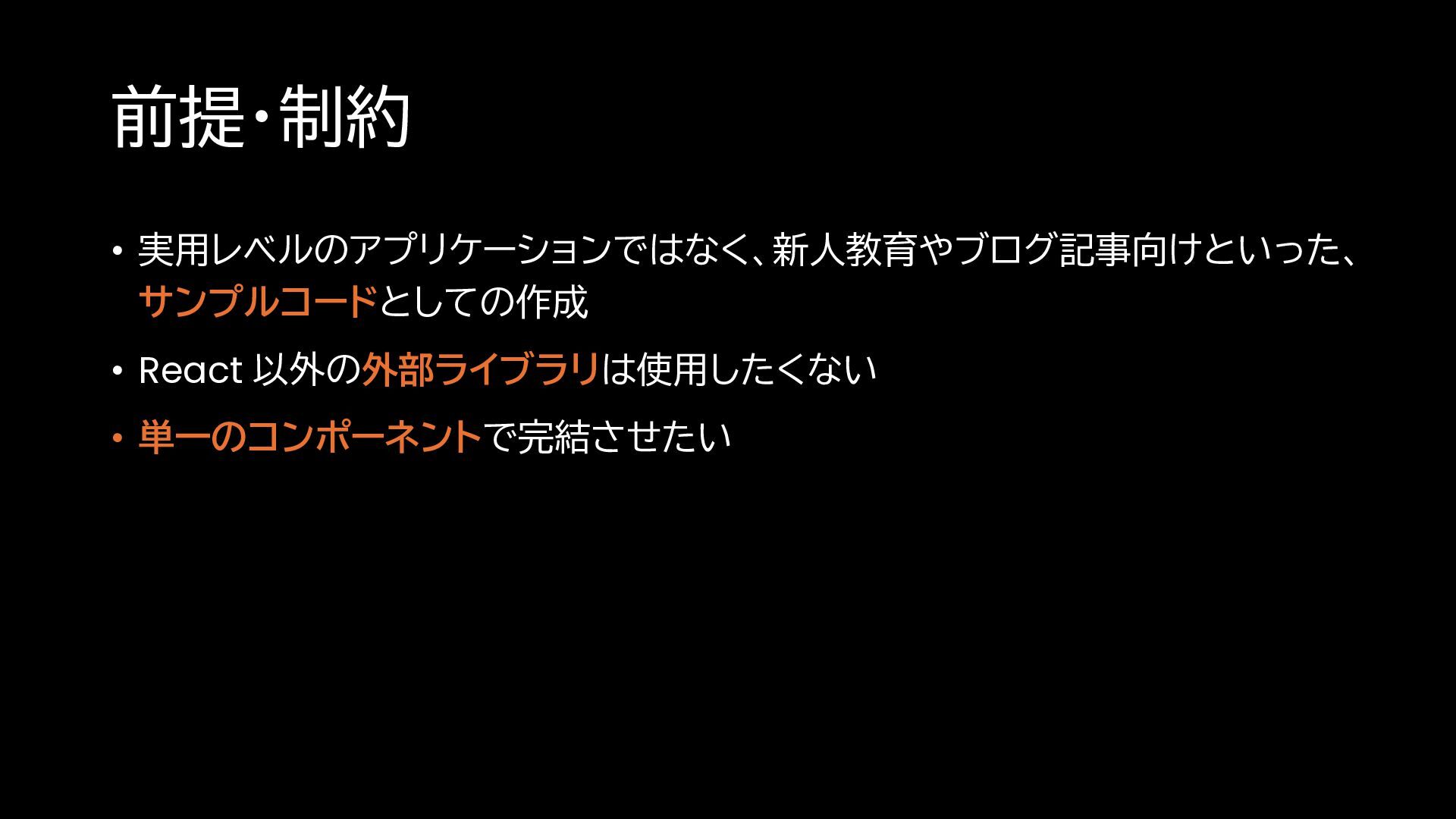 前提・制約 • 実用レベルのアプリケーションではなく、新人教育やブログ記事向けといった、 サンプルコードとしての作成 • React 以外の外部ライブラリは使用したくない • 単一のコンポーネントで完結させたい