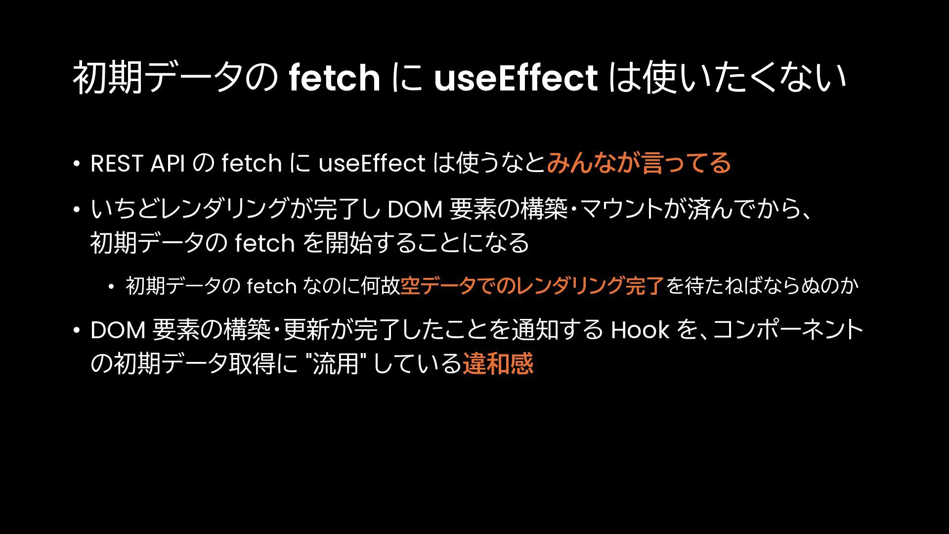 に useEffect は使うなとみんなが言ってる • いちどレンダリングが完了し DOM 要素の構築・マウントが済んでから、 初期データの fetch を開始することになる • 初期データの fetch なのに何故空データでのレンダリング完了を待たねばならぬのか • DOM 要素の構築・更新が完了したことを通知する Hook を、コンポーネント の初期データ取得に "流用" している違和感