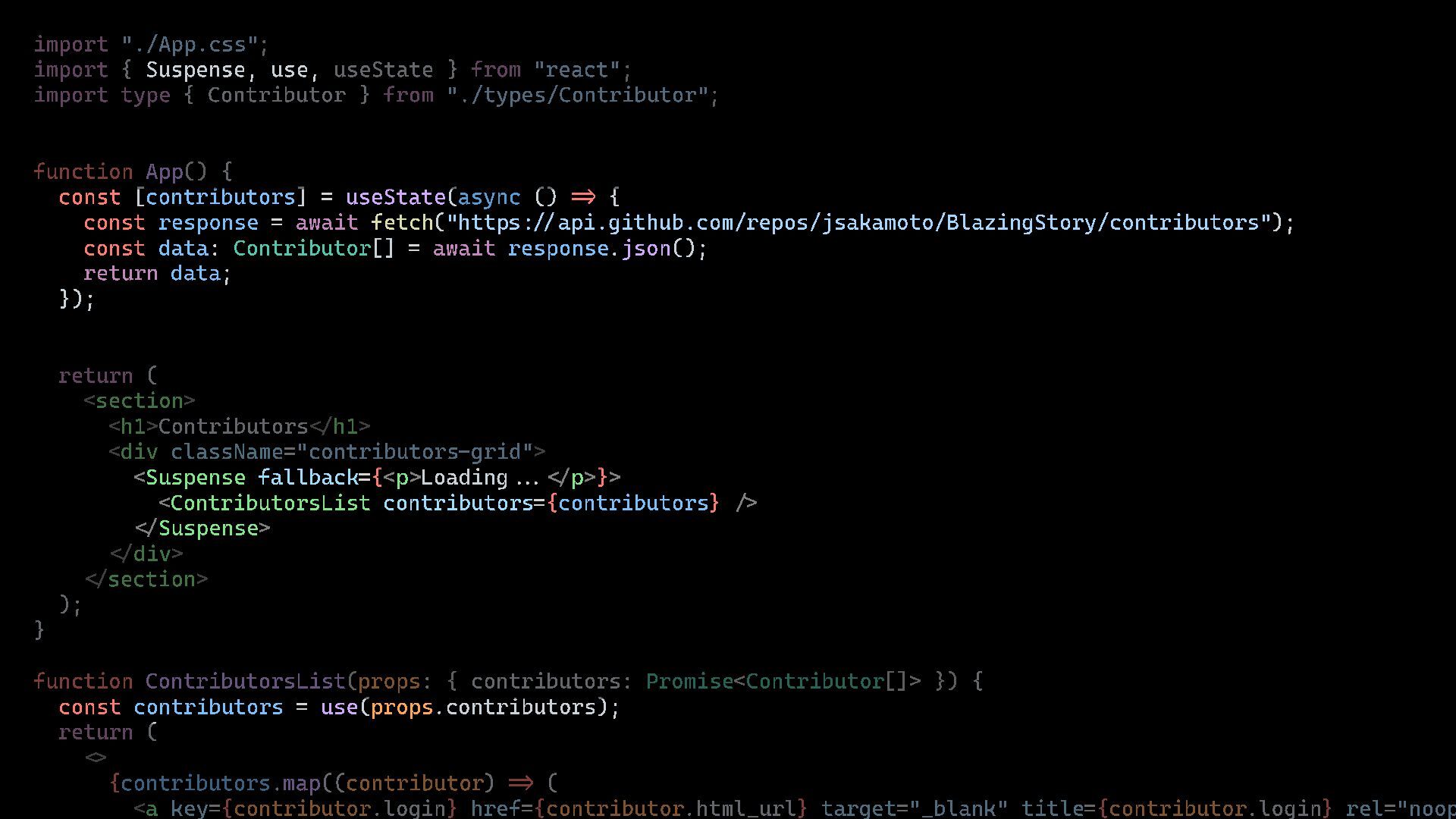 "react" ; import type { Contributor } from "./types/Contributor" ; function App() { const [ contributors ] = useState ( async () => { const response = await fetch ( " http s :// api.github. com/ repos/jsakamoto/BlazingStory/contributors" ); const data : Contributor [] = await response . json (); return data ; }); return ( <section > <h1>Contributors </ h1> <div className ="contributors - grid" > <Suspense fallback ={ <p>Loading... </ p>} > <ContributorsList contributors ={ contributors } /> </ Suspense > </ div > </ section > ); } function ContributorsList ( props : { contributors : Promise <Contributor []> }) { const contributors = use ( props .contributors ); return ( <> { contributors . map(( contributor ) => ( <a key ={ contributor .login } href ={ contributor .html_url } target ="_blank" title ={ contributor .login } rel =" noope