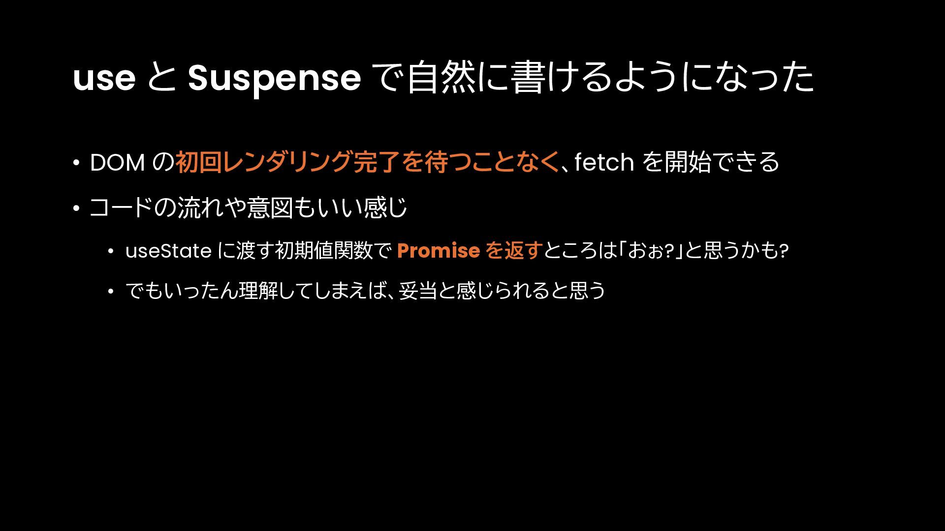 • useState に渡す初期値関数で Promise を返すところは「おぉ?」と思うかも? • でもいったん理解してしまえば、妥当と感じられると思う