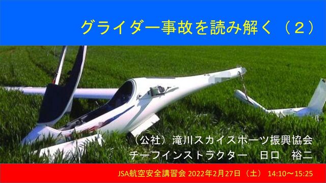グライダー事故を読み解く(2) (公社)滝川スカイスポーツ振興協会 チーフインストラクター 日口 裕二 JSA航空安全講習会 2022年2月27日(土) 14:10~15:25