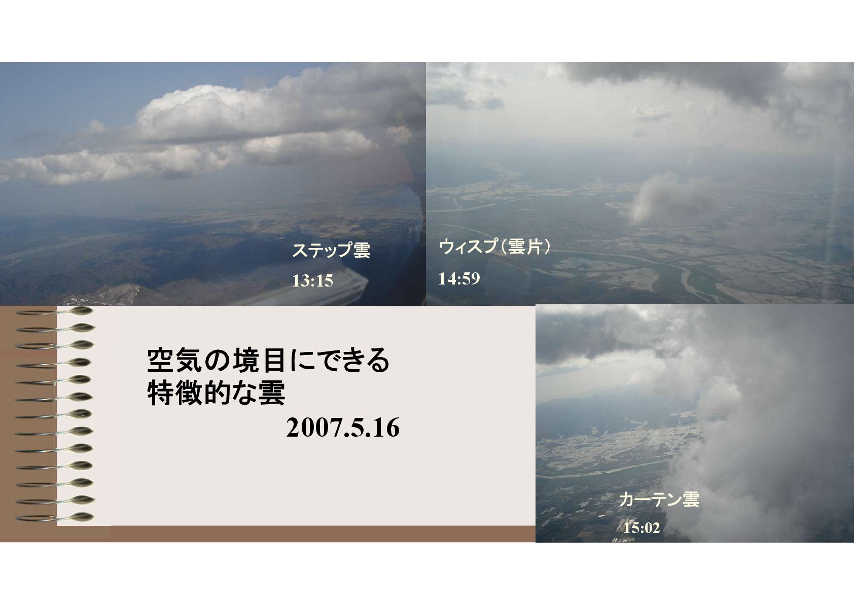 空気の境目にできる 特徴的な雲 2007.5.16 カーテン雲 15:02 ウィスプ(雲片) 14:59 ステップ雲 13:15