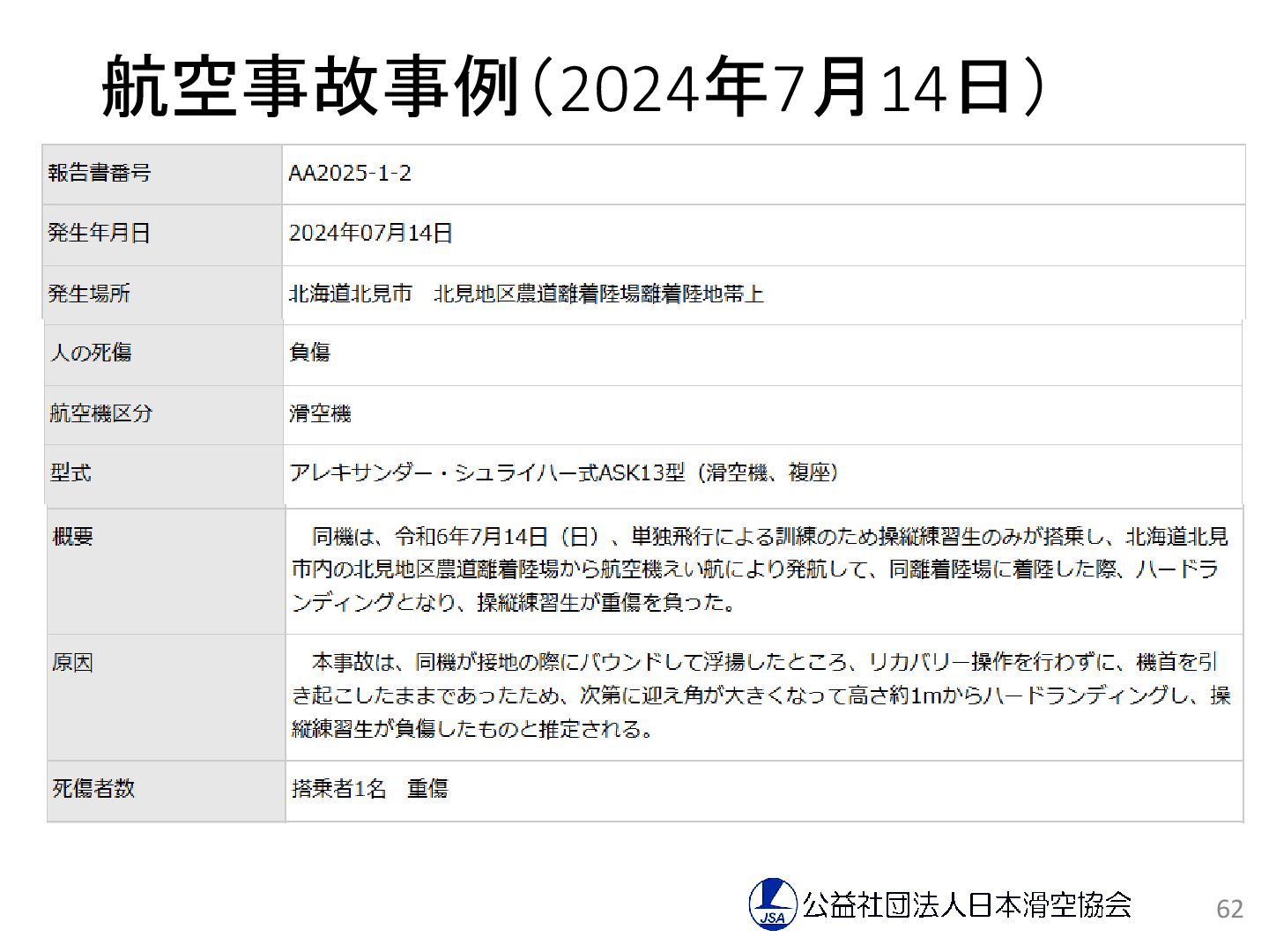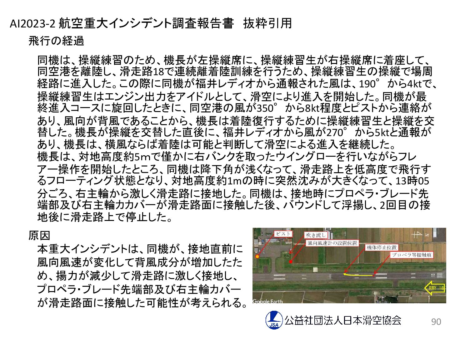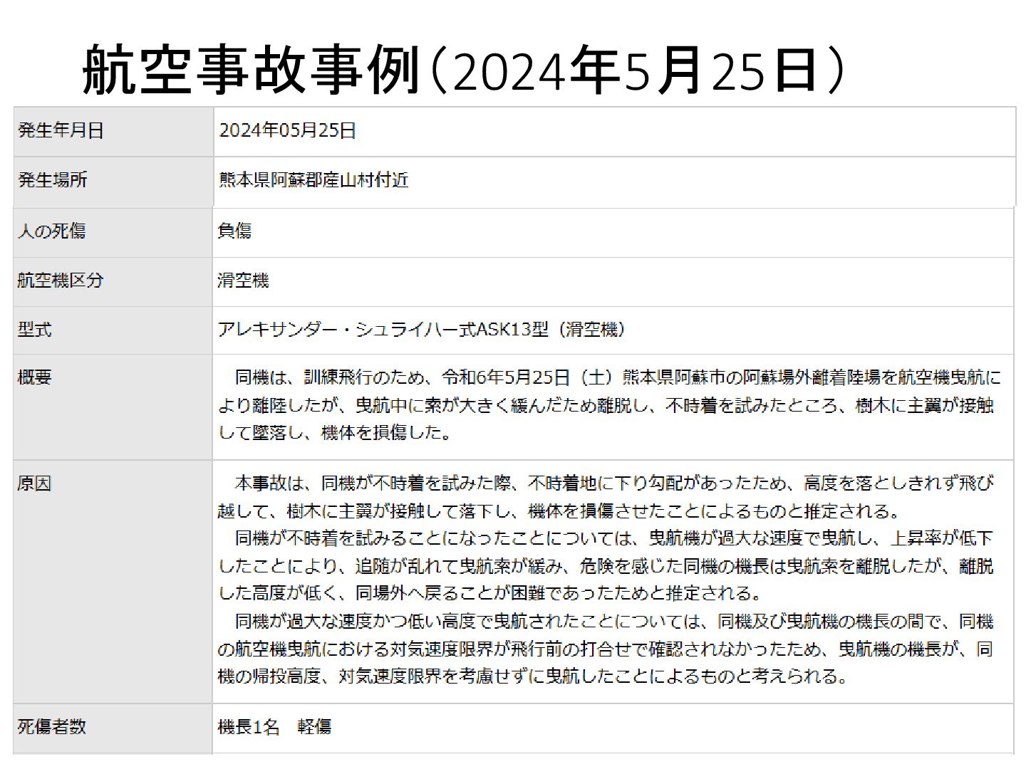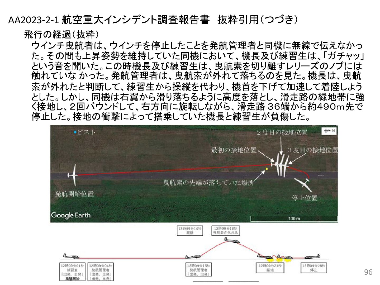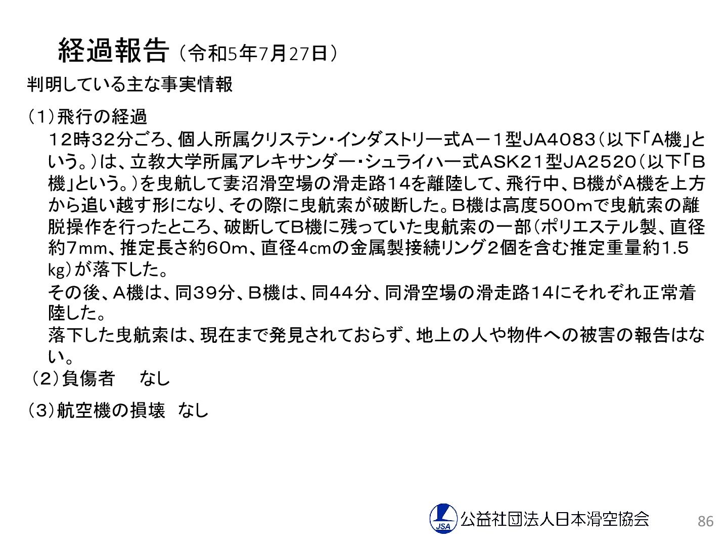 約7mm、推定長さ約60m、直径4cmの金属製接続リング2個を含む推定重量約1.5 kg)が落下した。 その後、A機は、同39分、B機は、同44分、同滑空場の滑走路14にそれぞれ正常着 陸した。 落下した曳航索は、現在まで発見されておらず、地上の人や物件への被害の報告はな い。 (2)負傷者 なし (3)航空機の損壊 なし