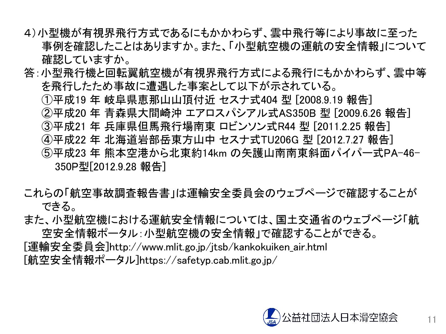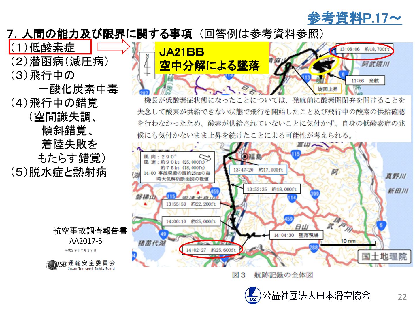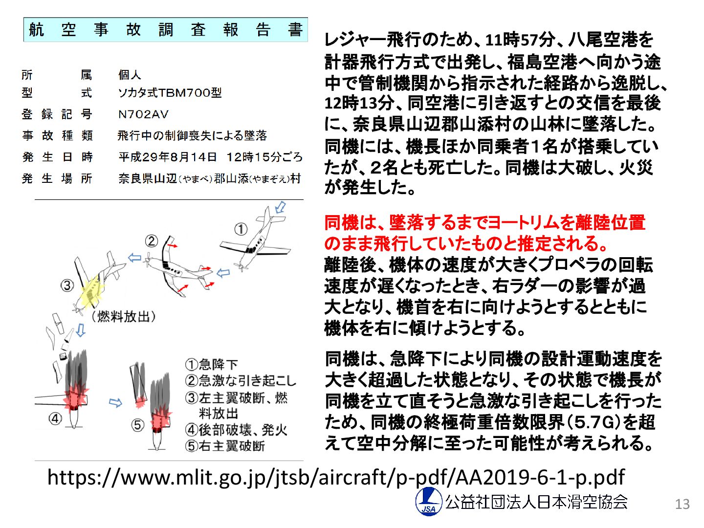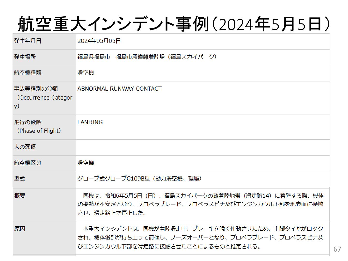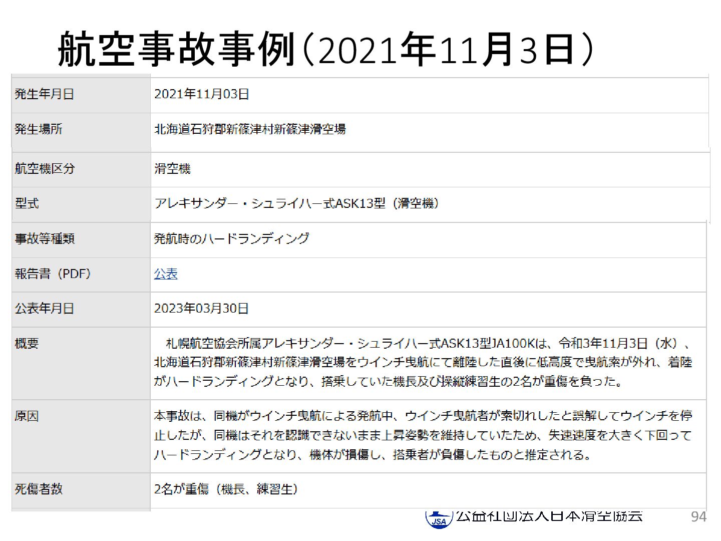 約7mm、推定長さ約60m、直径4cmの金属製接続リング2個を含む推定重量約1.5 kg)が落下した。 その後、A機は、同39分、B機は、同44分、同滑空場の滑走路14にそれぞれ正常着 陸した。 落下した曳航索は、現在まで発見されておらず、地上の人や物件への被害の報告はな い。 (2)負傷者 なし (3)航空機の損壊 なし