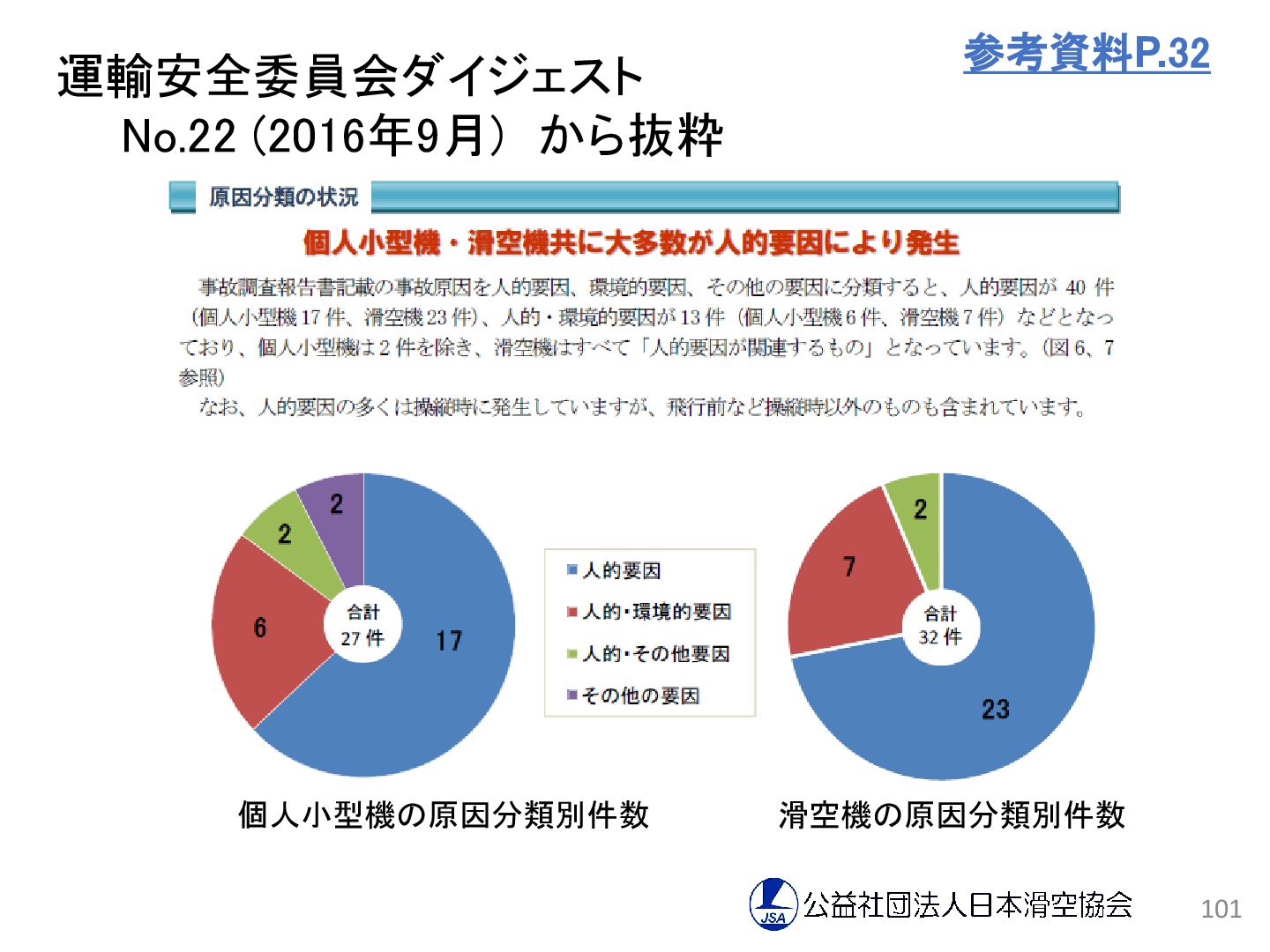 参考資料P.32 101 運輸安全委員会ダイジェスト No.22 (2016年9月) から抜粋 個人小型機の原因分類別件数 滑空機の原因分類別件数