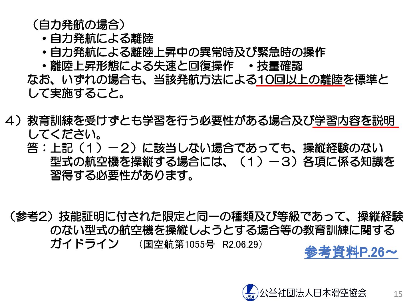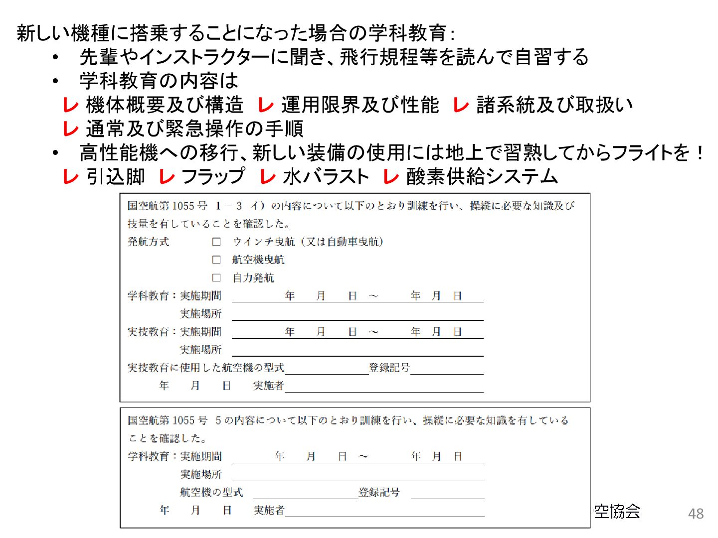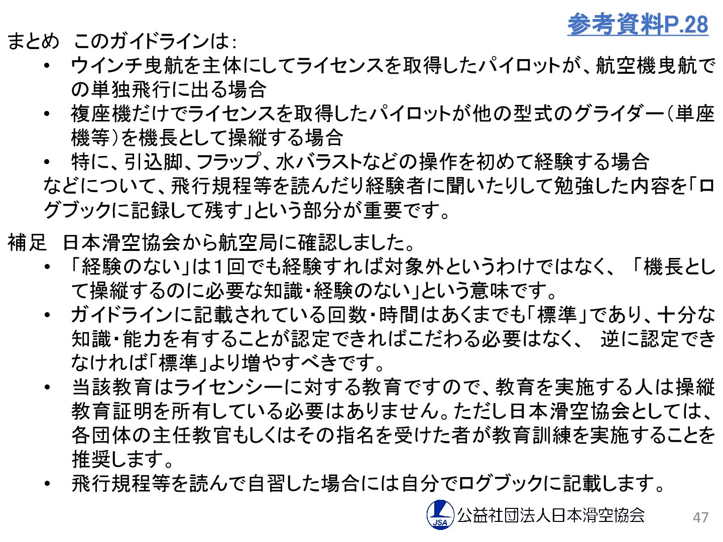 などについて、飛行規程等を読んだり経験者に聞いたりして勉強した内容を「ロ グブックに記録して残す」という部分が重要です。 補足 日本滑空協会から航空局に確認しました。 • 「経験のない」は1回でも経験すれば対象外というわけではなく、 「機長とし て操縦するのに必要な知識・経験のない」という意味です。 • ガイドラインに記載されている回数・時間はあくまでも「標準」であり、十分な 知識・能力を有することが認定できればこだわる必要はなく、 逆に認定でき なければ「標準」より増やすべきです。 • 当該教育はライセンシーに対する教育ですので、教育を実施する人は操縦 教育証明を所有している必要はありません。ただし日本滑空協会としては、 各団体の主任教官もしくはその指名を受けた者が教育訓練を実施することを 推奨します。 • 飛行規程等を読んで自習した場合には自分でログブックに記載します。 参考資料P.28 47