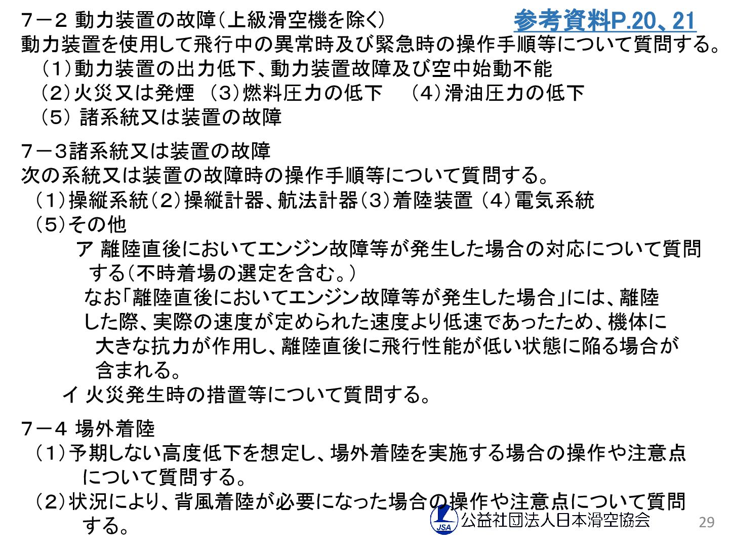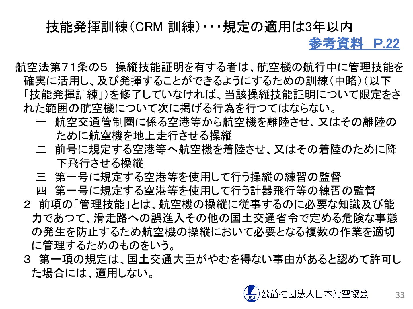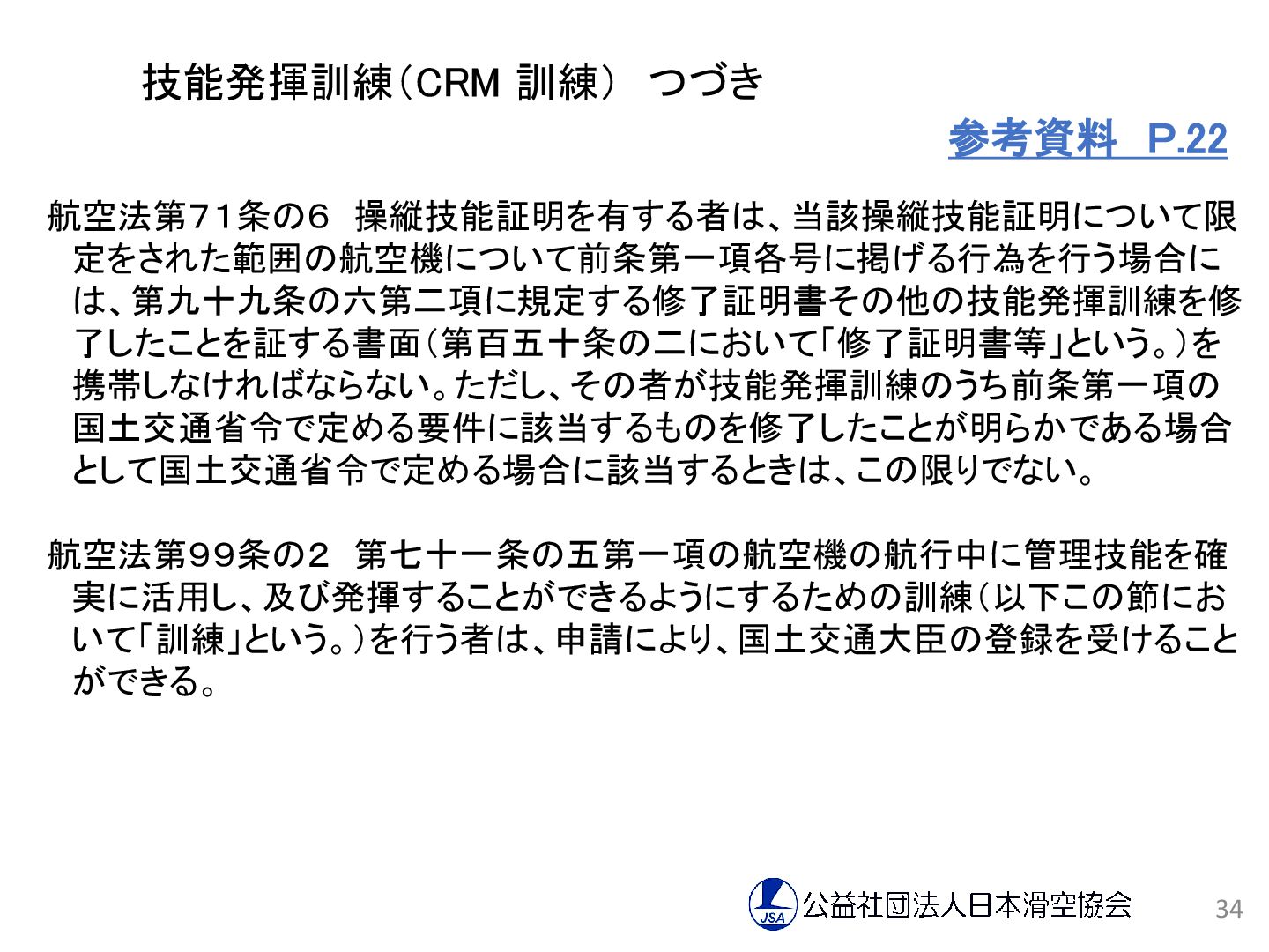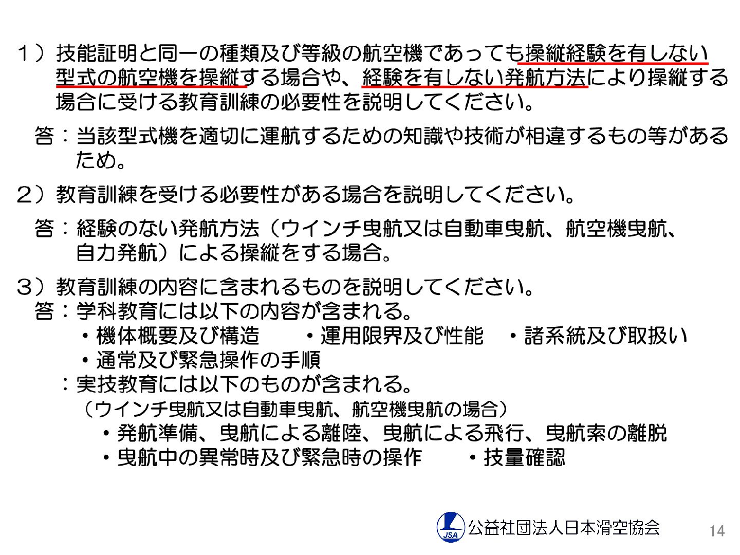 などについて、飛行規程等を読んだり経験者に聞いたりして勉強した内容を「ロ グブックに記録して残す」という部分が重要です。 補足 日本滑空協会から航空局に確認しました。 • 「経験のない」は1回でも経験すれば対象外というわけではなく、 「機長とし て操縦するのに必要な知識・経験のない」という意味です。 • ガイドラインに記載されている回数・時間はあくまでも「標準」であり、十分な 知識・能力を有することが認定できればこだわる必要はなく、 逆に認定でき なければ「標準」より増やすべきです。 • 当該教育はライセンシーに対する教育ですので、教育を実施する人は操縦 教育証明を所有している必要はありません。ただし日本滑空協会としては、 各団体の主任教官もしくはその指名を受けた者が教育訓練を実施することを 推奨します。 • 飛行規程等を読んで自習した場合には自分でログブックに記載します。 参考資料P.28 47