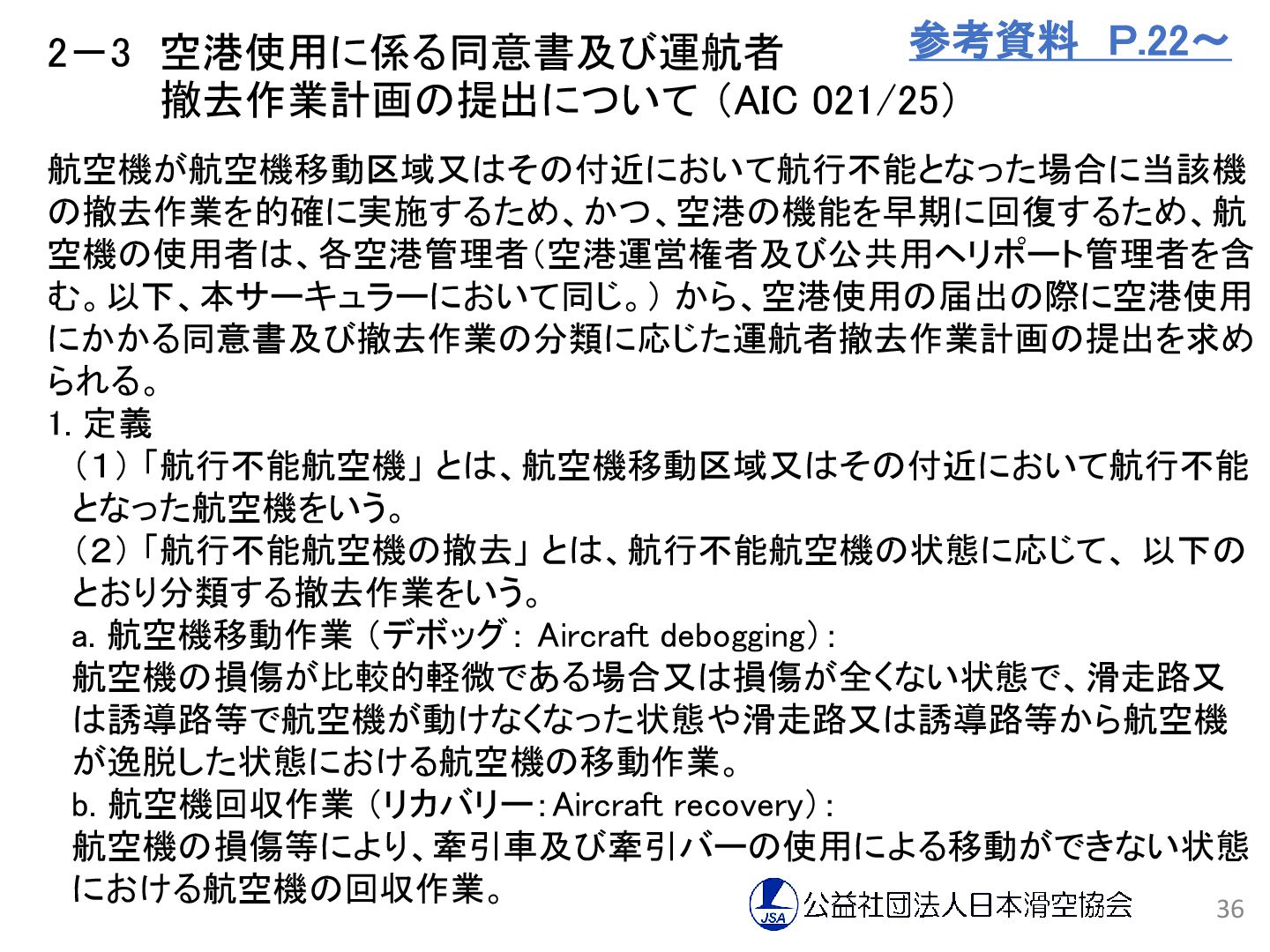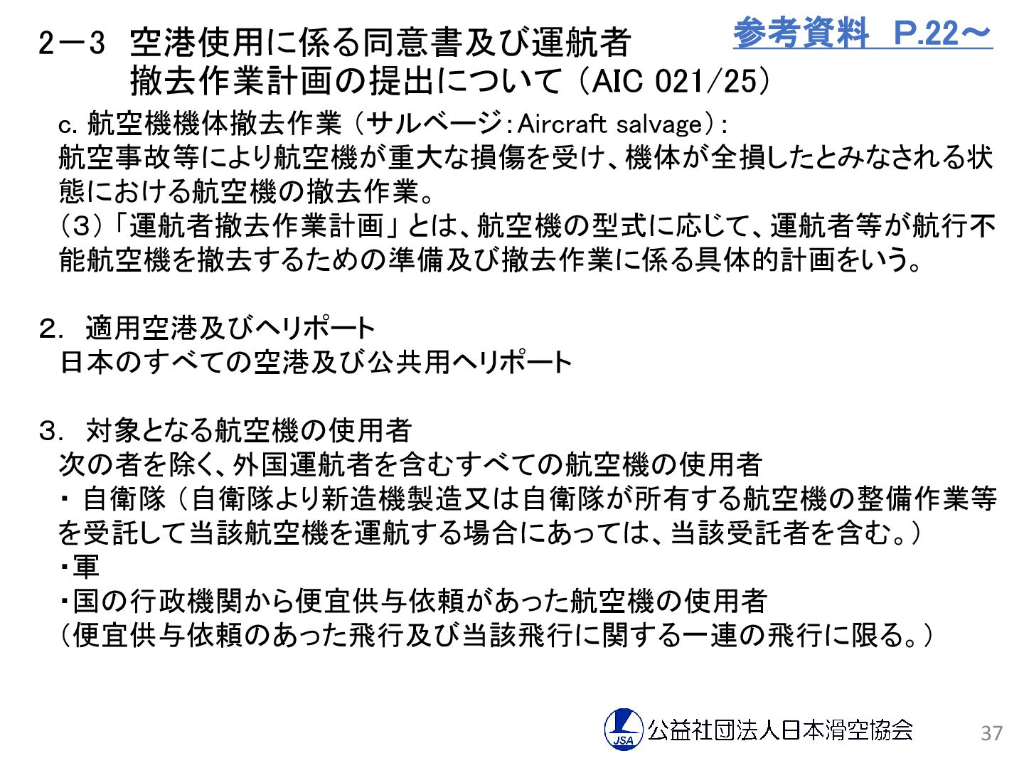 2. 適用空港及びヘリポート 日本のすべての空港及び公共用ヘリポート 3. 対象となる航空機の使用者 次の者を除く、外国運航者を含むすべての航空機の使用者 ・ 自衛隊 (自衛隊より新造機製造又は自衛隊が所有する航空機の整備作業等 を受託して当該航空機を運航する場合にあっては、当該受託者を含む。) ・軍 ・国の行政機関から便宜供与依頼があった航空機の使用者 (便宜供与依頼のあった飛行及び当該飛行に関する一連の飛行に限る。) 参考資料 P.22~ 37 2-3 空港使用に係る同意書及び運航者 撤去作業計画の提出について (AIC 021/25)