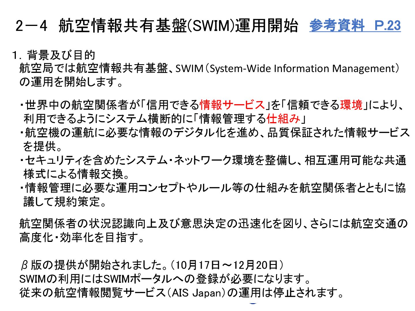 ・航空機の運航に必要な情報のデジタル化を進め、品質保証された情報サービス を提供。 ・セキュリティを含めたシステム・ネットワーク環境を整備し、相互運用可能な共通 様式による情報交換。 ・情報管理に必要な運用コンセプトやルール等の仕組みを航空関係者とともに協 議して規約策定。 航空関係者の状況認識向上及び意思決定の迅速化を図り、さらには航空交通の 高度化・効率化を目指す。 β版の提供が開始されました。(10月17日~12月20日) SWIMの利用にはSWIMポータルへの登録が必要になります。 従来の航空情報閲覧サービス(AIS Japan)の運用は停止されます。 参考資料 P.23