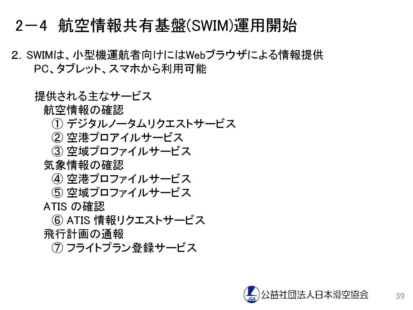 39 2-4 航空情報共有基盤(SWIM)運用開始 2.SWIMは、小型機運航者向けにはWebブラウザによる情報提供 PC、タブレット、スマホから利用可能 提供される主なサービス 航空情報の確認 ① デジタルノータムリクエストサービス ②