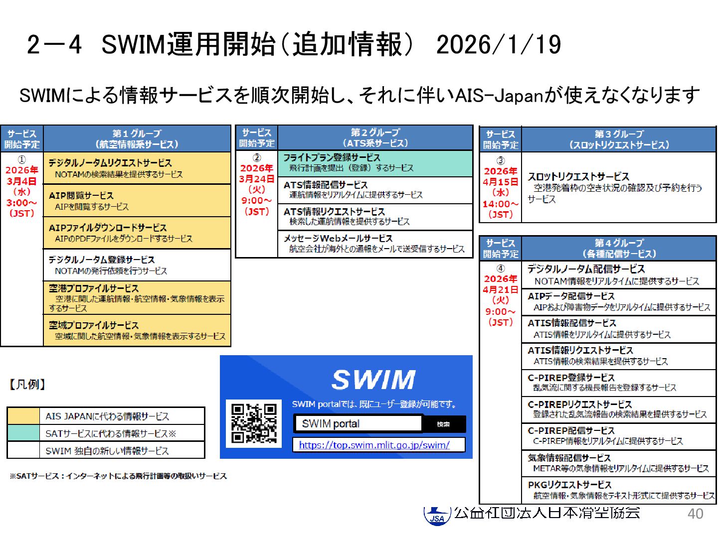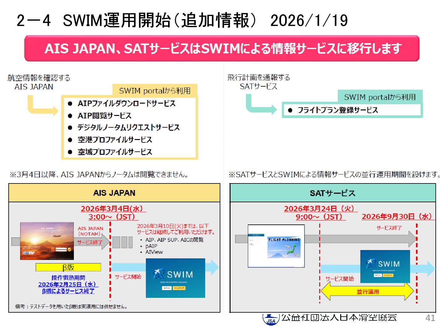 40 2-4 SWIM運用開始(追加情報) 2026/1/19 SWIMによる情報サービスを順次開始し、それに伴いAIS-Japanが使えなくなります