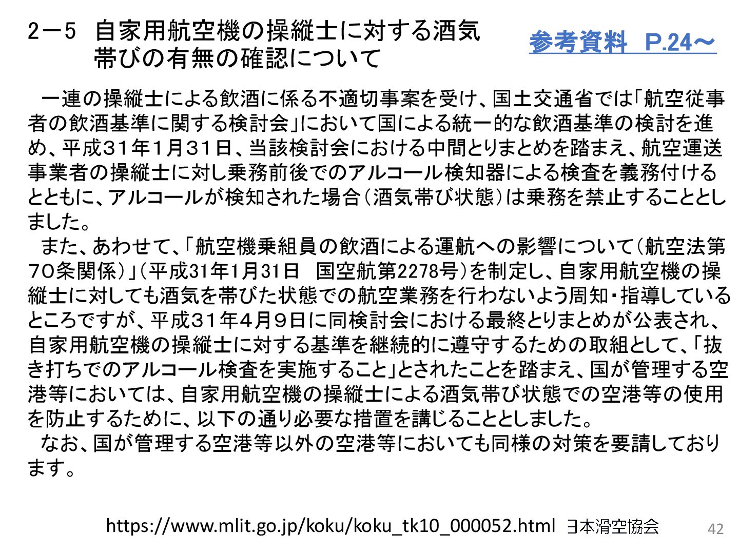 縦士に対しても酒気を帯びた状態での航空業務を行わないよう周知・指導している ところですが、平成31年4月9日に同検討会における最終とりまとめが公表され、 自家用航空機の操縦士に対する基準を継続的に遵守するための取組として、「抜 き打ちでのアルコール検査を実施すること」とされたことを踏まえ、国が管理する空 港等においては、自家用航空機の操縦士による酒気帯び状態での空港等の使用 を防止するために、以下の通り必要な措置を講じることとしました。 なお、国が管理する空港等以外の空港等においても同様の対策を要請しており ます。 参考資料 P.24~ 42 2-5 自家用航空機の操縦士に対する酒気 帯びの有無の確認について