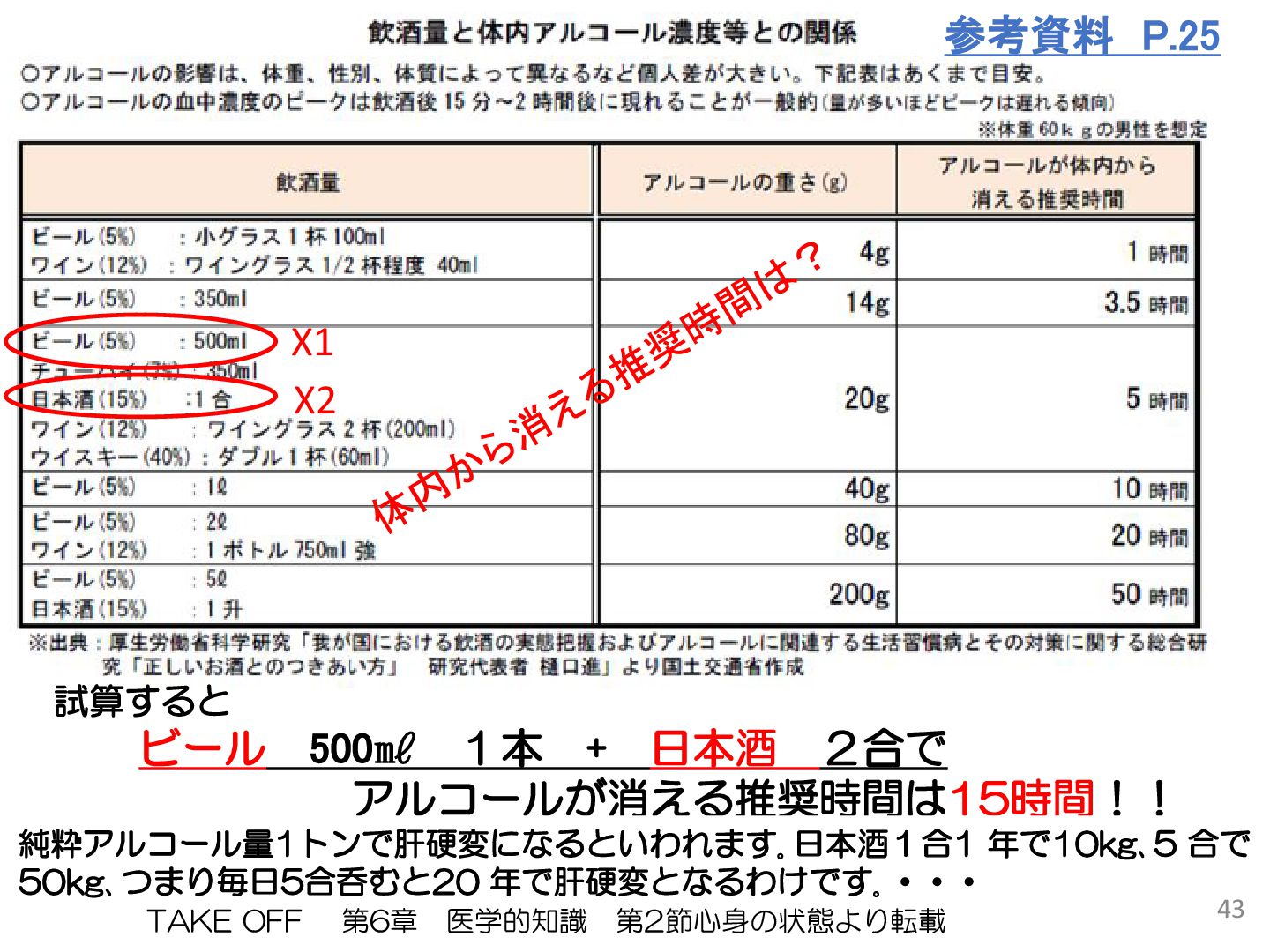 参考資料 P.25 試算すると ビール 500㎖ 1本 + 日本酒 2合で アルコールが消える推奨時間は15時間!!