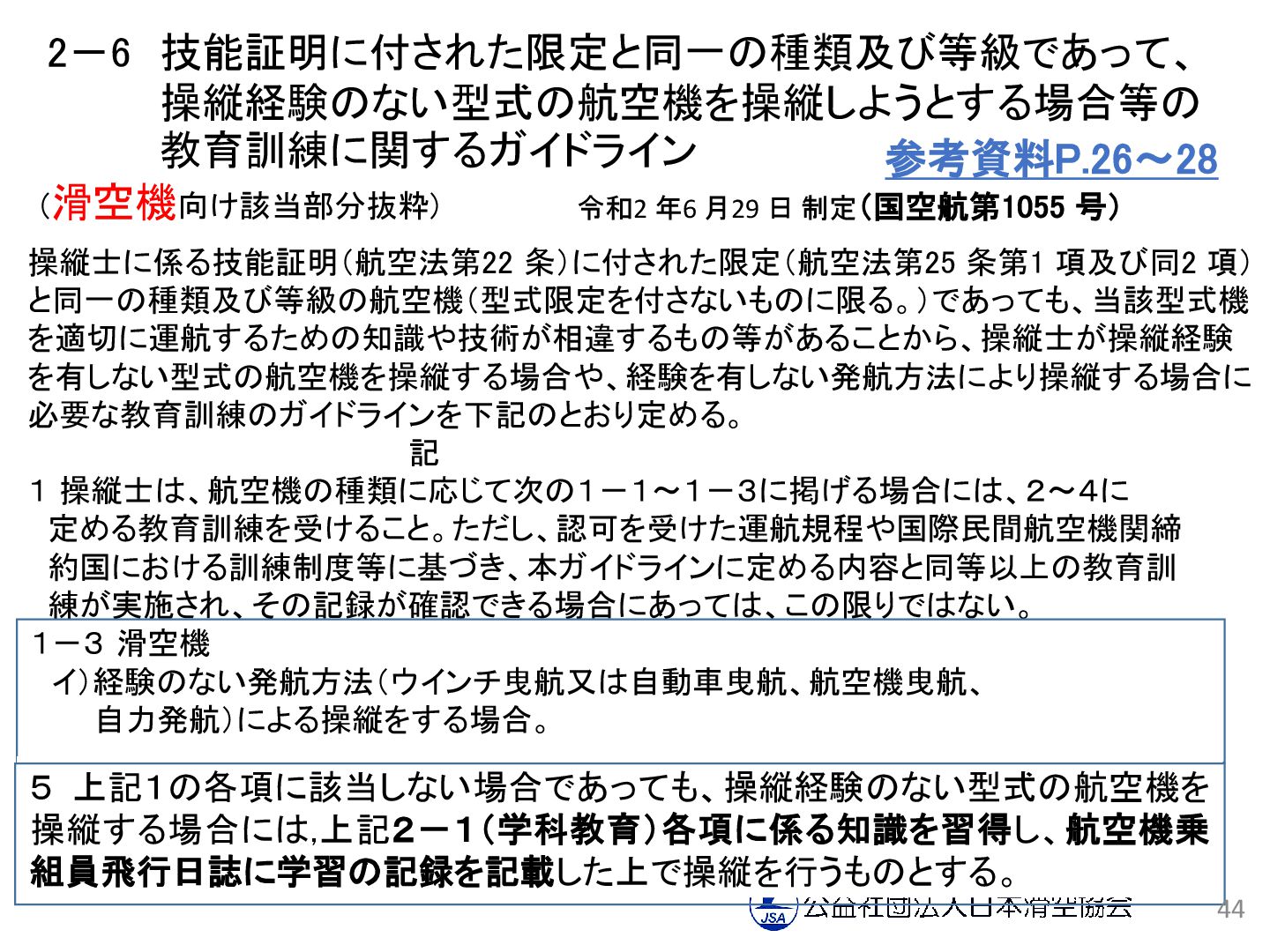 記 1 操縦士は、航空機の種類に応じて次の1-1~1-3に掲げる場合には、2~4に 定める教育訓練を受けること。ただし、認可を受けた運航規程や国際民間航空機関締 約国における訓練制度等に基づき、本ガイドラインに定める内容と同等以上の教育訓 練が実施され、その記録が確認できる場合にあっては、この限りではない。 1-3 滑空機 イ)経験のない発航方法(ウインチ曳航又は自動車曳航、航空機曳航、 自力発航)による操縦をする場合。 2-6 技能証明に付された限定と同一の種類及び等級であって、 操縦経験のない型式の航空機を操縦しようとする場合等の 教育訓練に関するガイドライン 令和2 年6 月29 日 制定(国空航第1055 号) 5 上記1の各項に該当しない場合であっても、操縦経験のない型式の航空機を 操縦する場合には,上記2-1(学科教育)各項に係る知識を習得し、航空機乗 組員飛行日誌に学習の記録を記載した上で操縦を行うものとする。 参考資料P.26~28 44