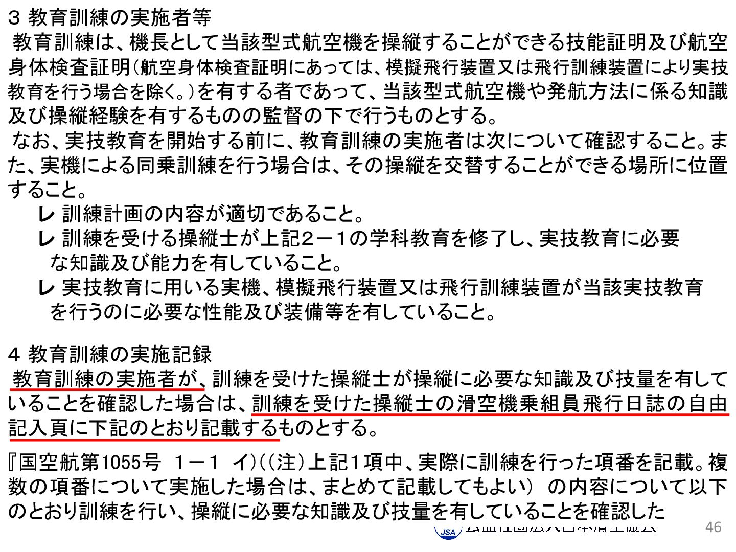訓練計画の内容が適切であること。 レ 訓練を受ける操縦士が上記2-1の学科教育を修了し、実技教育に必要 な知識及び能力を有していること。 レ 実技教育に用いる実機、模擬飛行装置又は飛行訓練装置が当該実技教育 を行うのに必要な性能及び装備等を有していること。 4 教育訓練の実施記録 教育訓練の実施者が、訓練を受けた操縦士が操縦に必要な知識及び技量を有して いることを確認した場合は、訓練を受けた操縦士の滑空機乗組員飛行日誌の自由 記入頁に下記のとおり記載するものとする。 『国空航第1055号 1-1 イ)((注)上記1項中、実際に訓練を行った項番を記載。複 数の項番について実施した場合は、まとめて記載してもよい) の内容について以下 のとおり訓練を行い、操縦に必要な知識及び技量を有していることを確認した 46