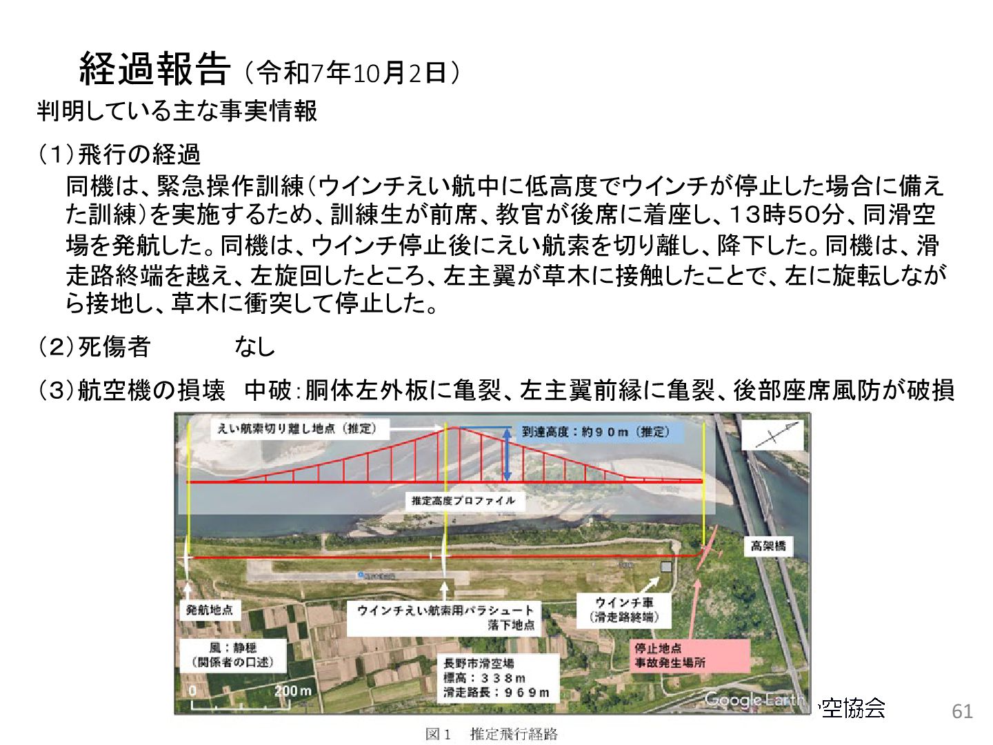 経過報告 (令和7年10月2日) 61 判明している主な事実情報 (1)飛行の経過 同機は、緊急操作訓練(ウインチえい航中に低高度でウインチが停止した場合に備え た訓練)を実施するため、訓練生が前席、教官が後席に着座し、13時50分、同滑空 場を発航した。同機は、ウインチ停止後にえい航索を切り離し、降下した。同機は、滑 走路終端を越え、左旋回したところ、左主翼が草木に接触したことで、左に旋転しなが ら接地し、草木に衝突して停止した。
