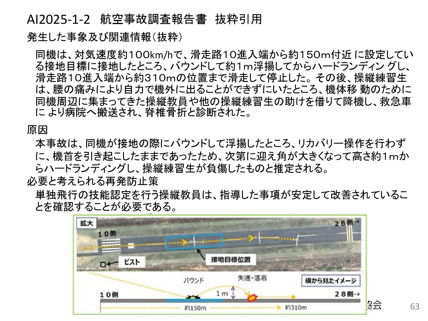 に より病院へ搬送され、脊椎骨折と診断された。 原因 本事故は、同機が接地の際にバウンドして浮揚したところ、リカバリー操作を行わず に、機首を引き起こしたままであったため、次第に迎え角が大きくなって高さ約1mか らハードランディングし、操縦練習生が負傷したものと推定される。 必要と考えられる再発防止策 単独飛行の技能認定を行う操縦教員は、指導した事項が安定して改善されているこ とを確認することが必要である。 63 AI2025-1-2 航空事故調査報告書 抜粋引用