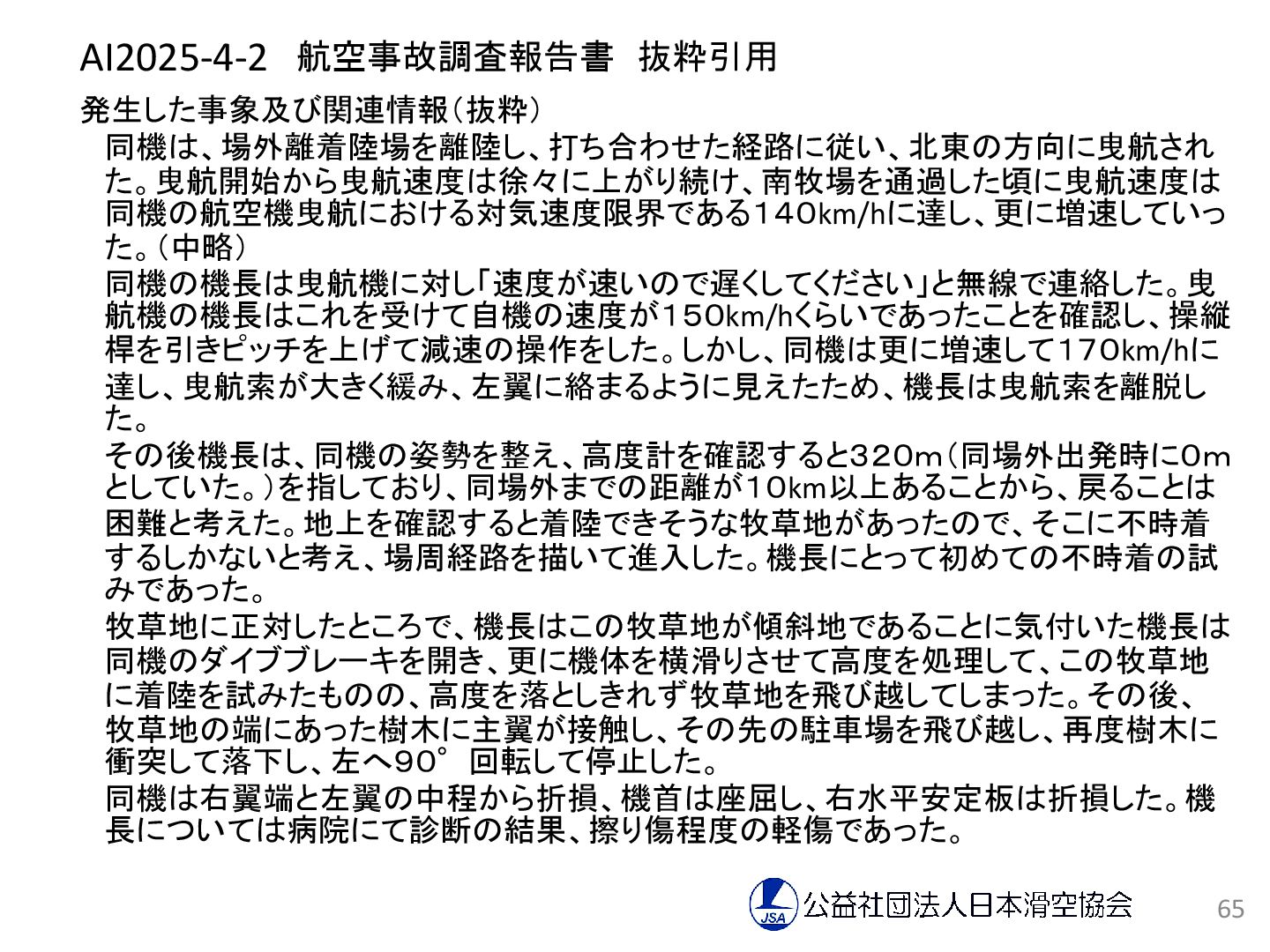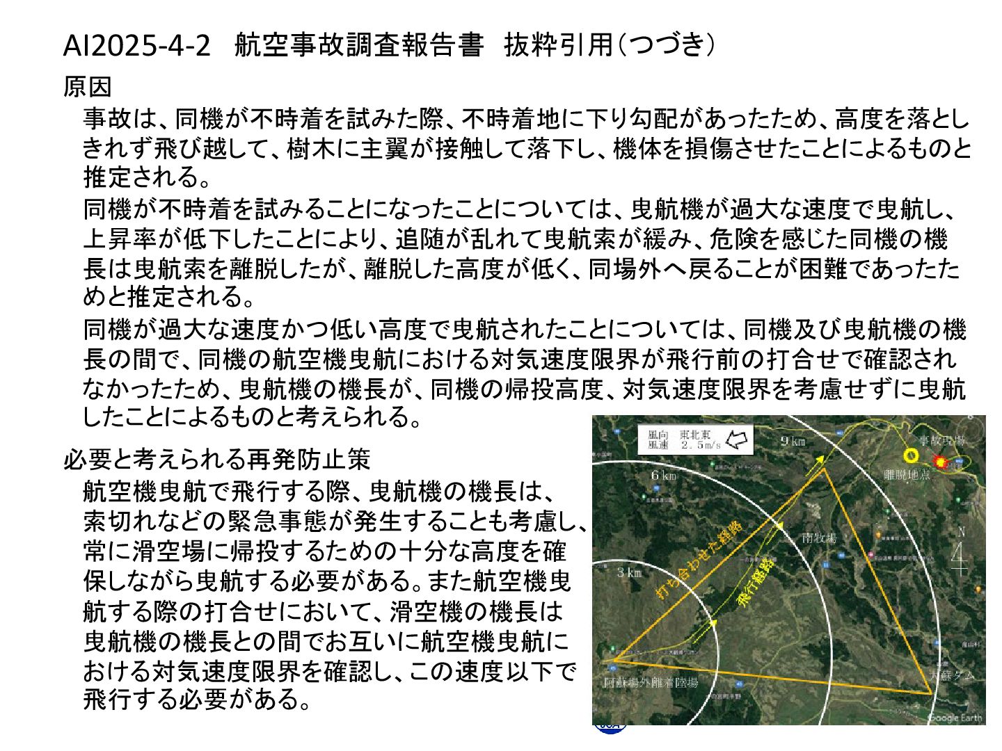 なかったため、曳航機の機長が、同機の帰投高度、対気速度限界を考慮せずに曳航 したことによるものと考えられる。 66 AI2025-4-2 航空事故調査報告書 抜粋引用(つづき) 必要と考えられる再発防止策 航空機曳航で飛行する際、曳航機の機長は、 索切れなどの緊急事態が発生することも考慮し、 常に滑空場に帰投するための十分な高度を確 保しながら曳航する必要がある。また航空機曳 航する際の打合せにおいて、滑空機の機長は 曳航機の機長との間でお互いに航空機曳航に おける対気速度限界を確認し、この速度以下で 飛行する必要がある。