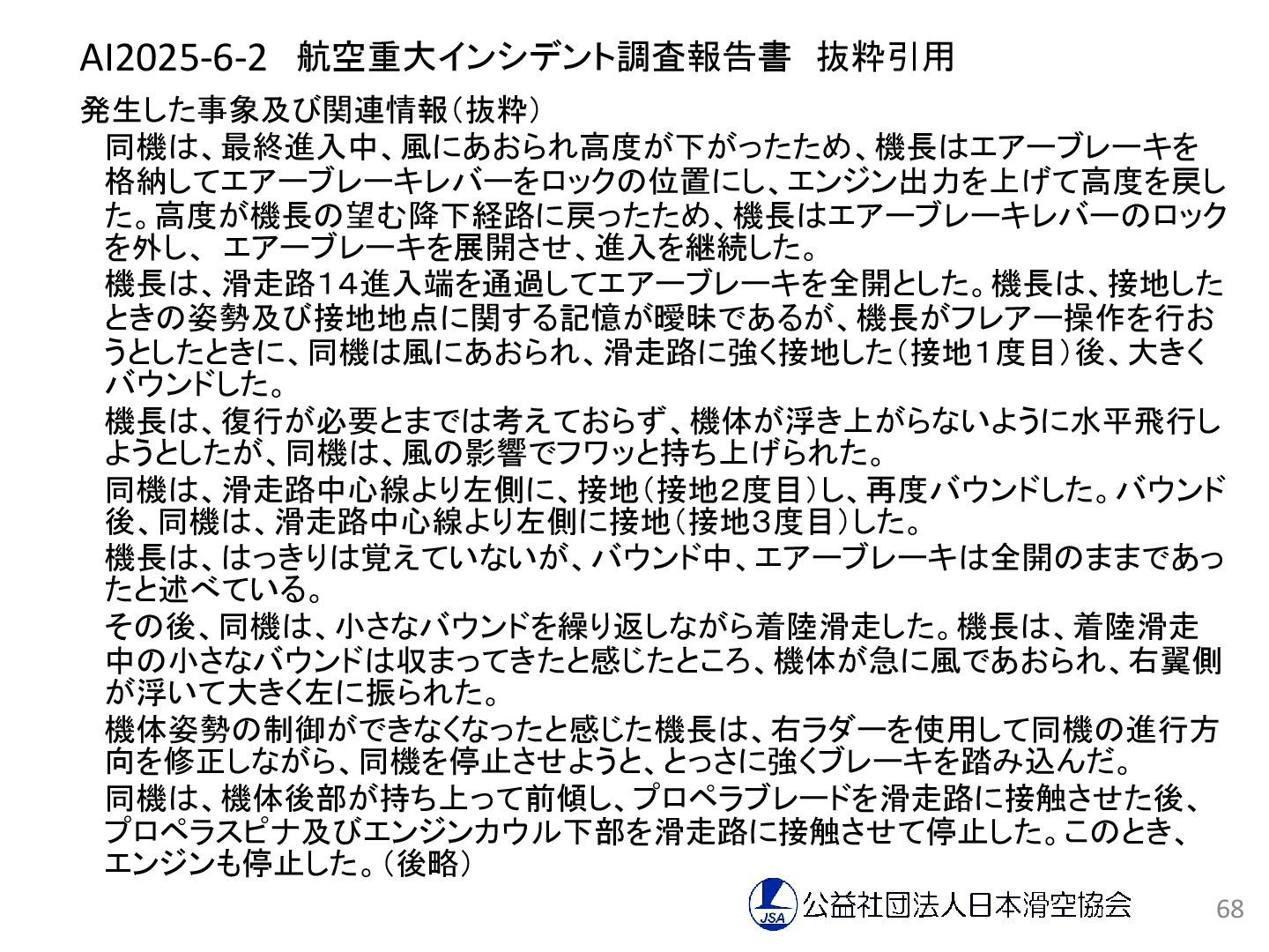 機長は、復行が必要とまでは考えておらず、機体が浮き上がらないように水平飛行し ようとしたが、同機は、風の影響でフワッと持ち上げられた。 同機は、滑走路中心線より左側に、接地(接地2度目)し、再度バウンドした。バウンド 後、同機は、滑走路中心線より左側に接地(接地3度目)した。 機長は、はっきりは覚えていないが、バウンド中、エアーブレーキは全開のままであっ たと述べている。 その後、同機は、小さなバウンドを繰り返しながら着陸滑走した。機長は、着陸滑走 中の小さなバウンドは収まってきたと感じたところ、機体が急に風であおられ、右翼側 が浮いて大きく左に振られた。 機体姿勢の制御ができなくなったと感じた機長は、右ラダーを使用して同機の進行方 向を修正しながら、同機を停止させようと、とっさに強くブレーキを踏み込んだ。 同機は、機体後部が持ち上って前傾し、プロペラブレードを滑走路に接触させた後、 プロペラスピナ及びエンジンカウル下部を滑走路に接触させて停止した。このとき、 エンジンも停止した。(後略) 68 AI2025-6-2 航空重大インシデント調査報告書 抜粋引用