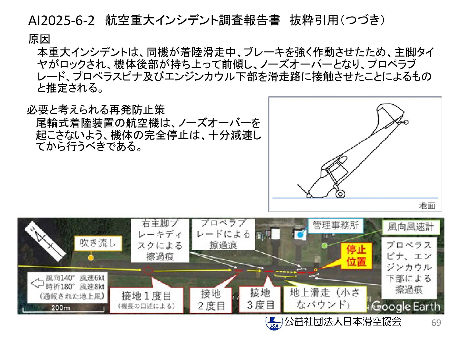 原因 本重大インシデントは、同機が着陸滑走中、ブレーキを強く作動させたため、主脚タイ ヤがロックされ、機体後部が持ち上って前傾し、ノーズオーバーとなり、プロペラブ レード、プロペラスピナ及びエンジンカウル下部を滑走路に接触させたことによるもの と推定される。 69 AI2025-6-2 航空重大インシデント調査報告書 抜粋引用(つづき) 必要と考えられる再発防止策