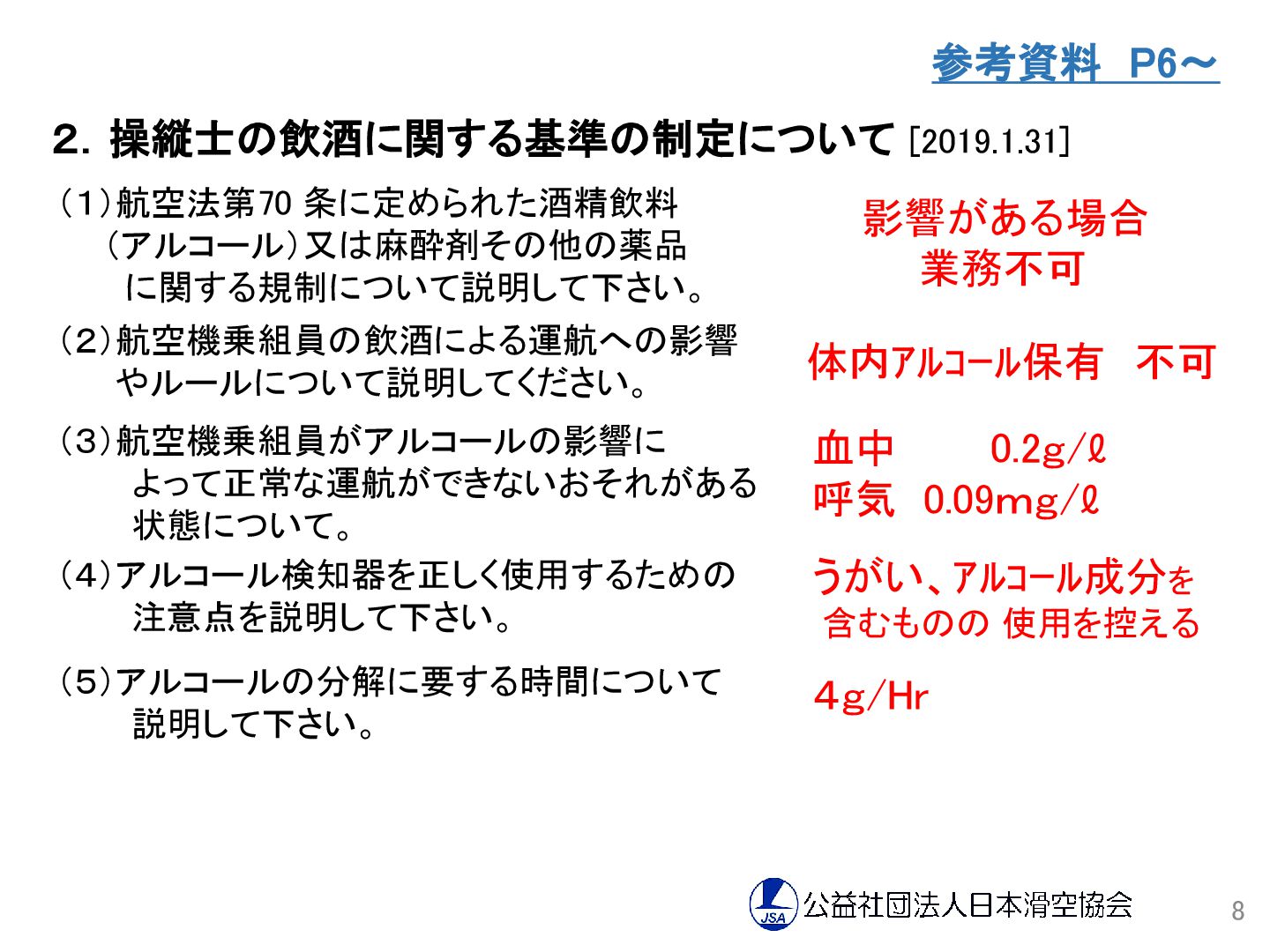 https://www.mlit.go.jp/koku/koku_tk10_000052.html 一連の操縦士による飲酒に係る不適切事案を受け、国土交通省では「航空従事 者の飲酒基準に関する検討会」において国による統一的な飲酒基準の検討を進 め、平成31年1月31日、当該検討会における中間とりまとめを踏まえ、航空運送 事業者の操縦士に対し乗務前後でのアルコール検知器による検査を義務付ける とともに、アルコールが検知された場合(酒気帯び状態)は乗務を禁止することとし ました。 また、あわせて、「航空機乗組員の飲酒による運航への影響について(航空法第 70条関係)」(平成31年1月31日 国空航第2278号)を制定し、自家用航空機の操