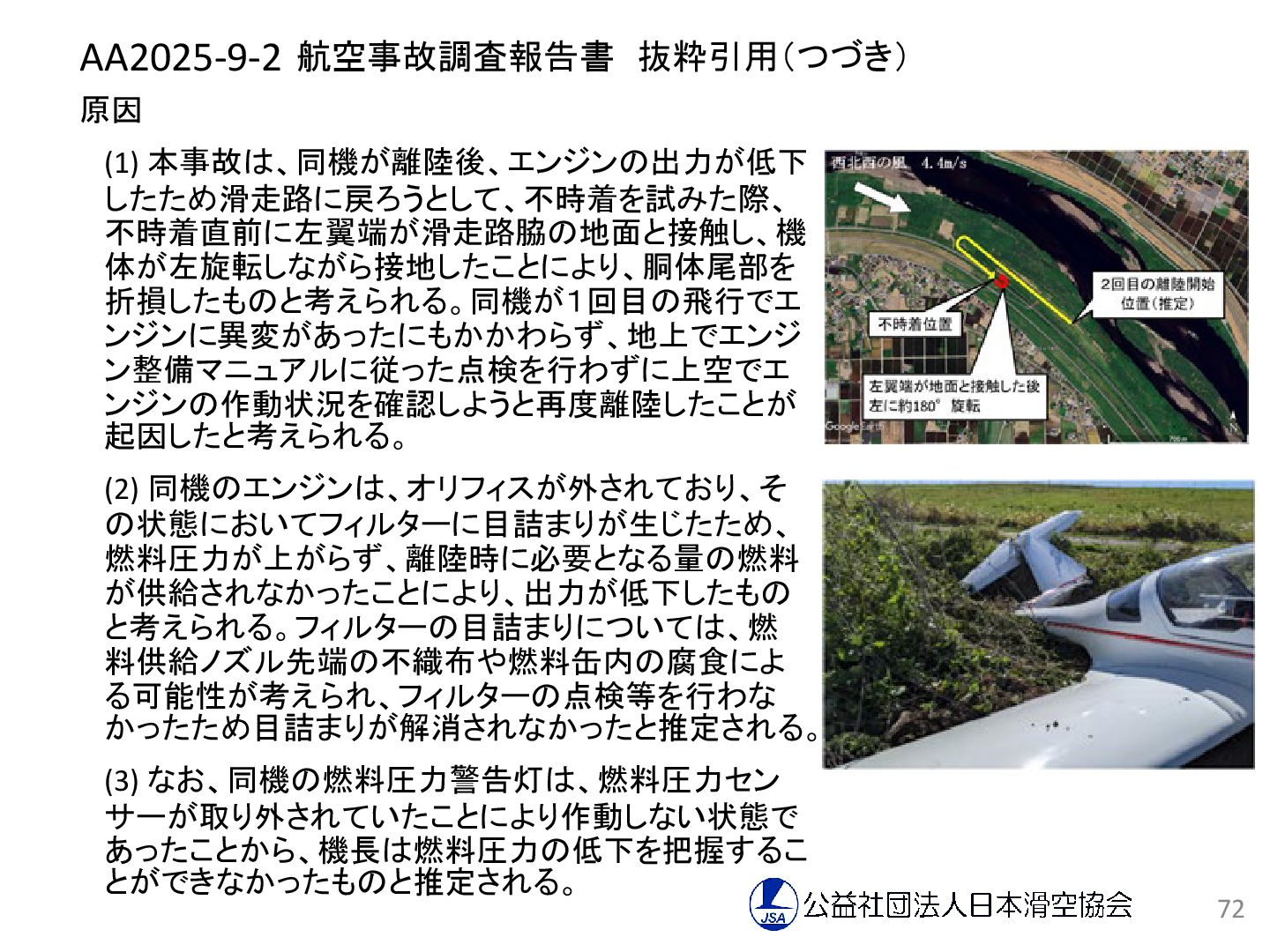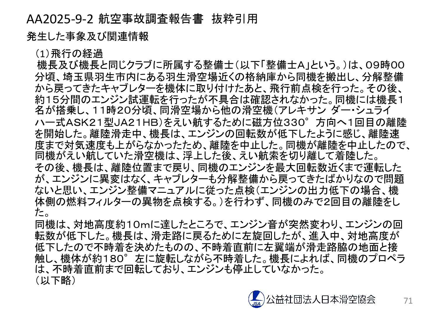 度まで対気速度も上がらなかったため、離陸を中止した。同機が離陸を中止したので、 同機がえい航していた滑空機は、浮上した後、えい航索を切り離して着陸した。 その後、機長は、離陸位置まで戻り、同機のエンジンを最大回転数近くまで運転した が、エンジンに異変はなく、キャブレターも分解整備から戻ってきたばかりなので問題 ないと思い、エンジン整備マニュアルに従った点検(エンジンの出力低下の場合、機 体側の燃料フィルターの異物を点検する。)を行わず、同機のみで2回目の離陸をし た。 同機は、対地高度約10mに達したところで、エンジン音が突然変わり、エンジンの回 転数が低下した。機長は、滑走路に戻るために左旋回したが、進入中、対地高度が 低下したので不時着を決めたものの、不時着直前に左翼端が滑走路脇の地面と接 触し、機体が約180°左に旋転しながら不時着した。機長によれば、同機のプロペラ は、不時着直前まで回転しており、エンジンも停止していなかった。 (以下略) 71 AA2025-9-2 航空事故調査報告書 抜粋引用