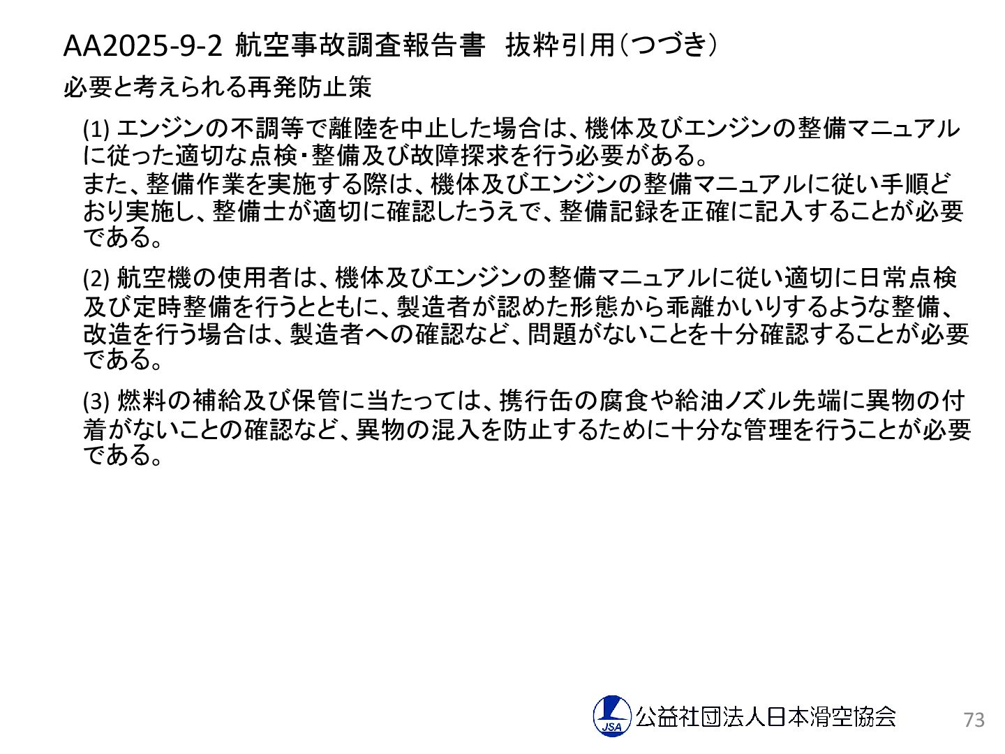 改造を行う場合は、製造者への確認など、問題がないことを十分確認することが必要 である。 (3) 燃料の補給及び保管に当たっては、携行缶の腐食や給油ノズル先端に異物の付 着がないことの確認など、異物の混入を防止するために十分な管理を行うことが必要 である。 73 AA2025-9-2 航空事故調査報告書 抜粋引用(つづき)
