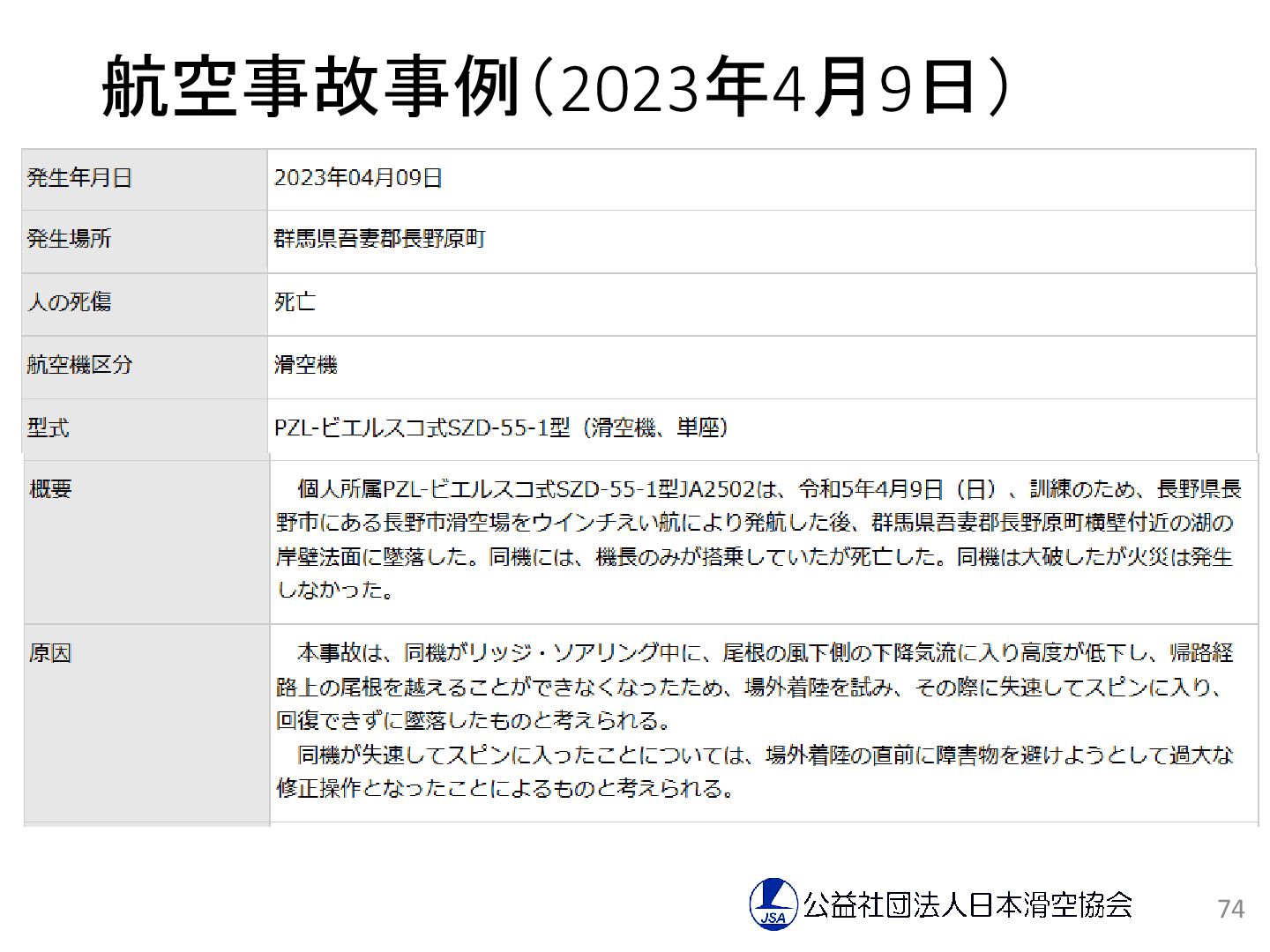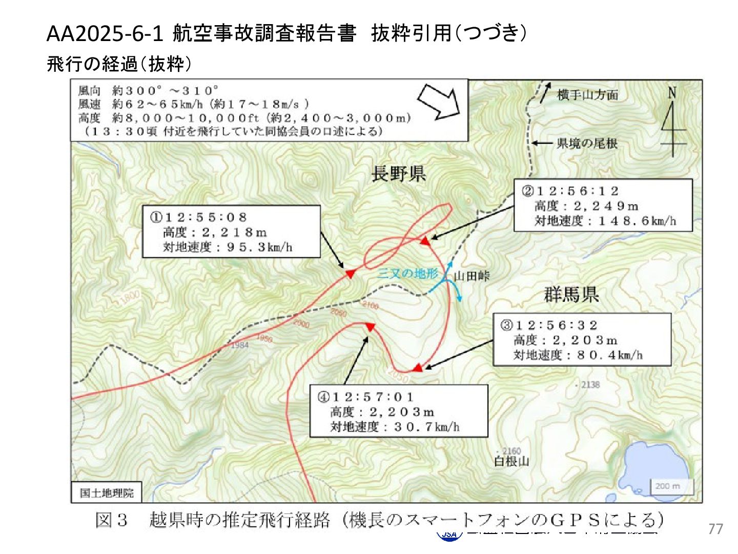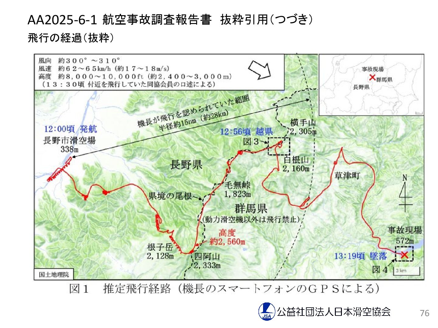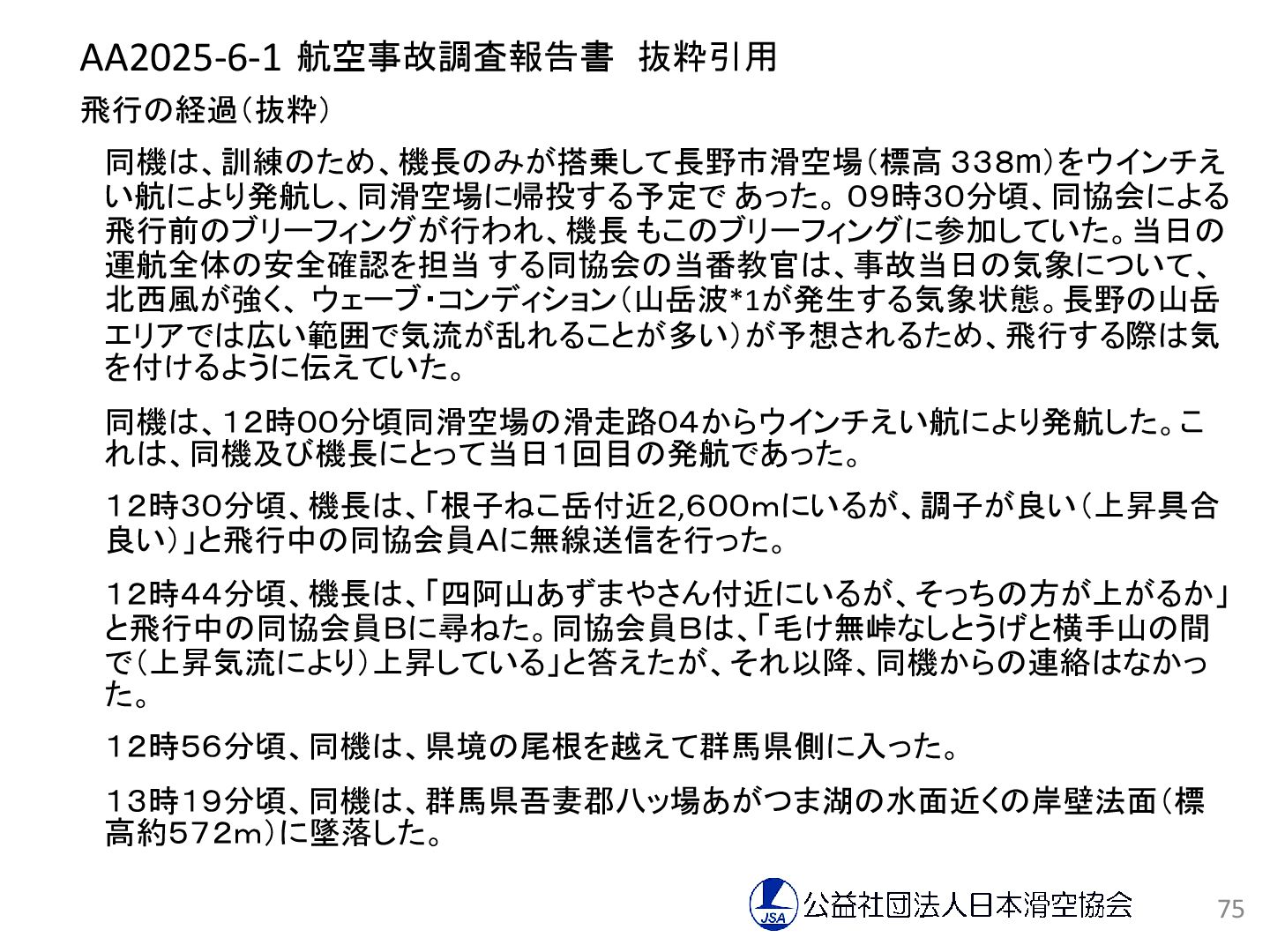 北西風が強く、 ウェーブ・コンディション(山岳波*1が発生する気象状態。長野の山岳 エリアでは広い範囲で気流が乱れることが多い)が予想されるため、飛行する際は気 を付けるように伝えていた。 同機は、12時00分頃同滑空場の滑走路04からウインチえい航により発航した。こ れは、同機及び機長にとって当日1回目の発航であった。 12時30分頃、機長は、「根子ねこ岳付近2,600mにいるが、調子が良い(上昇具合 良い)」と飛行中の同協会員Aに無線送信を行った。 12時44分頃、機長は、「四阿山あずまやさん付近にいるが、そっちの方が上がるか」 と飛行中の同協会員Bに尋ねた。同協会員Bは、「毛け無峠なしとうげと横手山の間 で(上昇気流により)上昇している」と答えたが、それ以降、同機からの連絡はなかっ た。 12時56分頃、同機は、県境の尾根を越えて群馬県側に入った。 13時19分頃、同機は、群馬県吾妻郡八ッ場あがつま湖の水面近くの岸壁法面(標 高約572m)に墜落した。 75 AA2025-6-1 航空事故調査報告書 抜粋引用