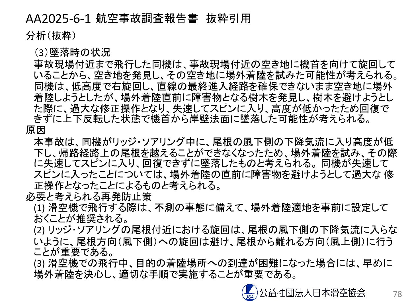 下し、帰路経路上の尾根を越えることができなくなったため、場外着陸を試み、その際 に失速してスピンに入り、回復できずに墜落したものと考えられる。 同機が失速して スピンに入ったことについては、場外着陸の直前に障害物を避けようとして過大な 修 正操作となったことによるものと考えられる。 必要と考えられる再発防止策 (1) 滑空機で飛行する際は、不測の事態に備えて、場外着陸適地を事前に設定して おくことが推奨される。 (2) リッジ・ソアリングの尾根付近における旋回は、尾根の風下側の下降気流に入らな いように、尾根方向(風下側)への旋回は避け、尾根から離れる方向(風上側)に行う ことが重要である。 (3) 滑空機での飛行中、目的の着陸場所への到達が困難になった場合には、早めに 場外着陸を決心し、適切な手順で実施することが重要である。 78 AA2025-6-1 航空事故調査報告書 抜粋引用