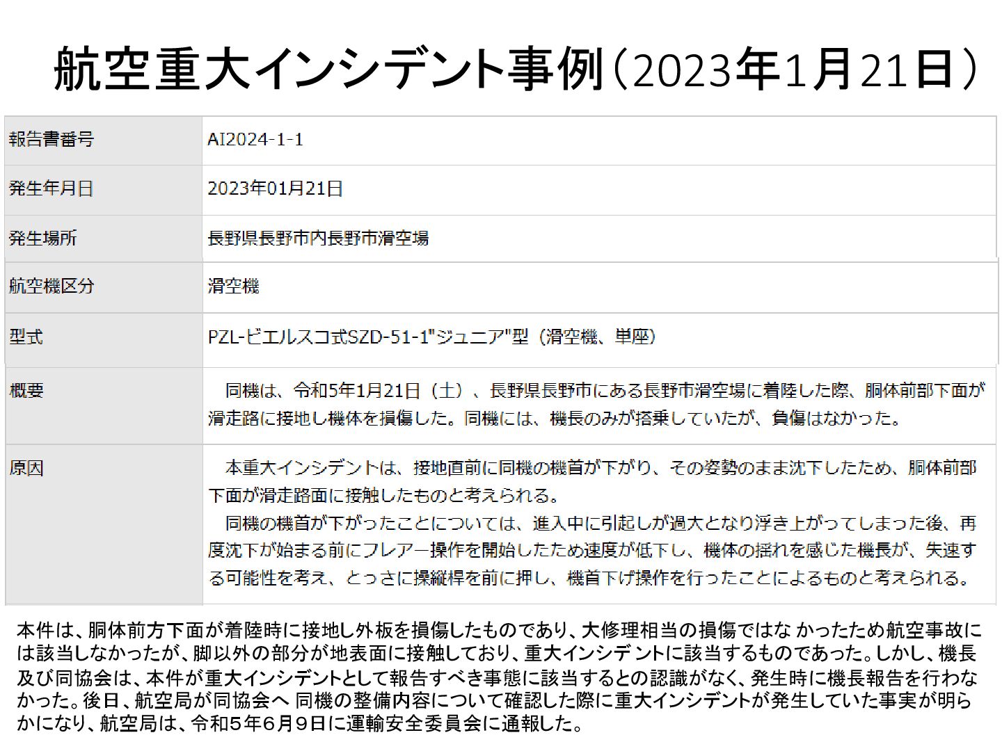 航空重大インシデント事例(2023年1月21日) 80 本件は、胴体前方下面が着陸時に接地し外板を損傷したものであり、大修理相当の損傷ではな かったため航空事故に は該当しなかったが、脚以外の部分が地表面に接触しており、重大インシデ ントに該当するものであった。しかし、機長 及び同協会は、本件が重大インシデントとして報告すべき事態に該当するとの認識がなく、発生時に機長報告を行わな かった。後日、航空局が同協会へ 同機の整備内容について確認した際に重大インシデントが発生していた事実が明ら かになり、航空局は、令和5年6月9日に運輸安全委員会に通報した。