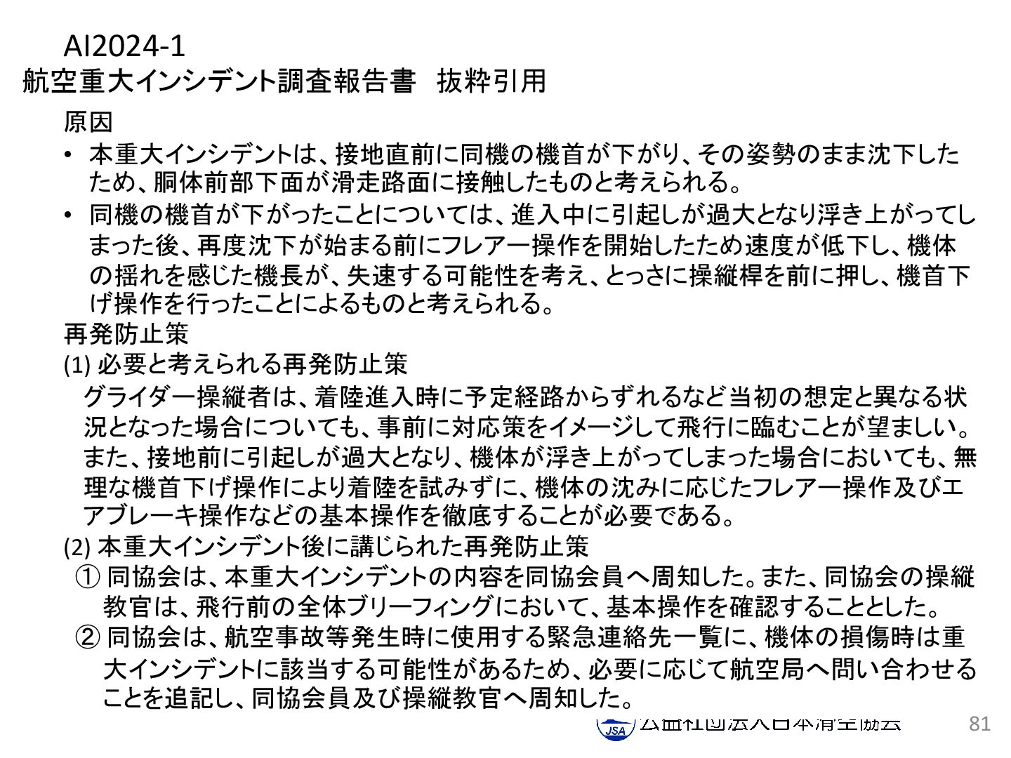 (1) 必要と考えられる再発防止策 グライダー操縦者は、着陸進入時に予定経路からずれるなど当初の想定と異なる状 況となった場合についても、事前に対応策をイメージして飛行に臨むことが望ましい。 また、接地前に引起しが過大となり、機体が浮き上がってしまった場合においても、無 理な機首下げ操作により着陸を試みずに、機体の沈みに応じたフレアー操作及びエ アブレーキ操作などの基本操作を徹底することが必要である。 (2) 本重大インシデント後に講じられた再発防止策 ① 同協会は、本重大インシデントの内容を同協会員へ周知した。また、同協会の操縦 教官は、飛行前の全体ブリーフィングにおいて、基本操作を確認することとした。 ② 同協会は、航空事故等発生時に使用する緊急連絡先一覧に、機体の損傷時は重 大インシデントに該当する可能性があるため、必要に応じて航空局へ問い合わせる ことを追記し、同協会員及び操縦教官へ周知した。 81 AI2024-1 航空重大インシデント調査報告書 抜粋引用