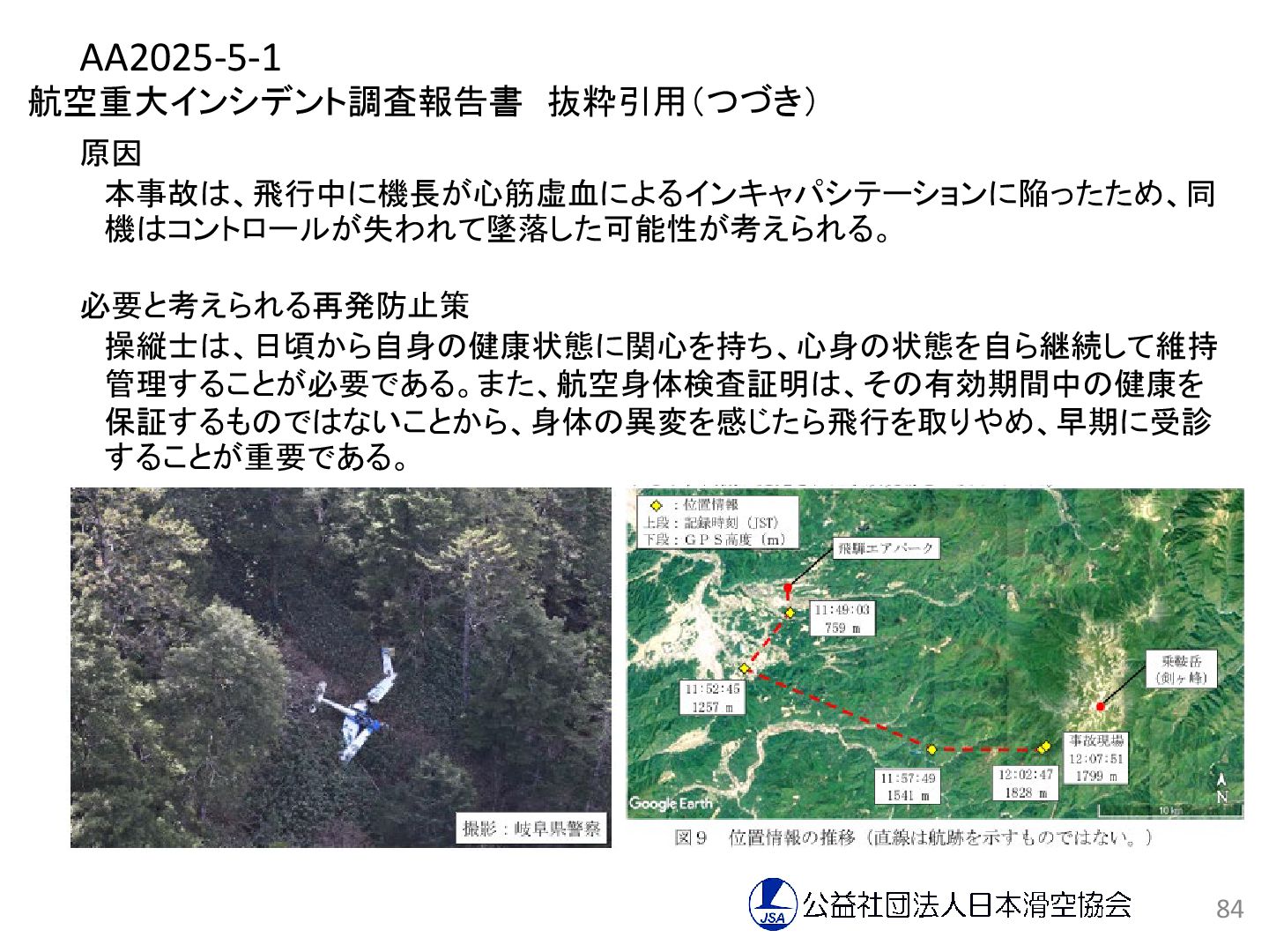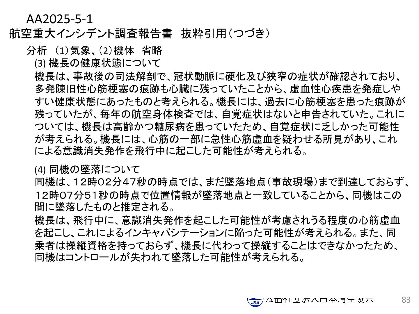 が考えられる。機長には、心筋の一部に急性心筋虚血を疑わせる所見があり、これ による意識消失発作を飛行中に起こした可能性が考えられる。 (4) 同機の墜落について 同機は、12時02分47秒の時点では、まだ墜落地点(事故現場)まで到達しておらず、 12時07分51秒の時点で位置情報が墜落地点と一致していることから、同機はこの 間に墜落したものと推定される。 機長は、飛行中に、意識消失発作を起こした可能性が考慮されうる程度の心筋虚血 を起こし、これによるインキャパシテーションに陥った可能性が考えられる。また、同 乗者は操縦資格を持っておらず、機長に代わって操縦することはできなかったため、 同機はコントロールが失われて墜落した可能性が考えられる。 83 AA2025-5-1 航空重大インシデント調査報告書 抜粋引用(つづき)