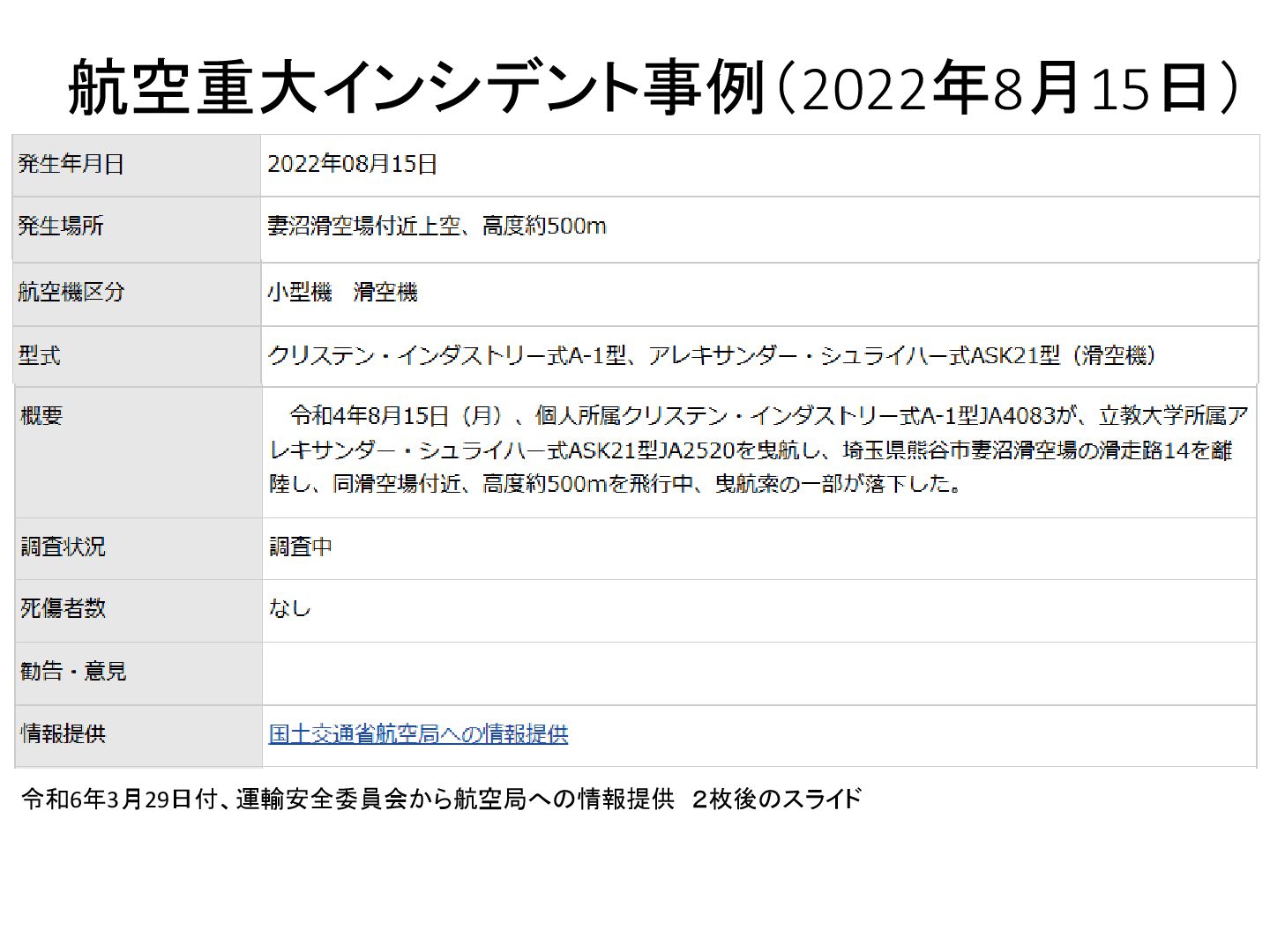 航空重大インシデント事例(2022年8月15日) 85 令和6年3月29日付、運輸安全委員会から航空局への情報提供 2枚後のスライド